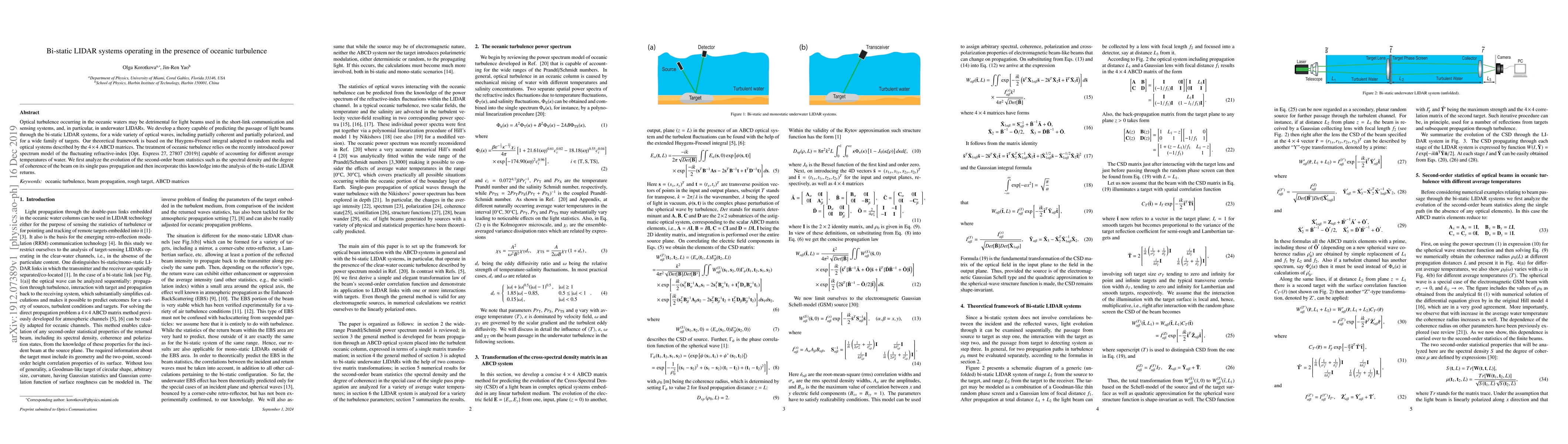 Optical turbulence occurring in the oceanic waters may be detrimental for light beams used in the short-link communication and sensing systems, and, in particular, in underwater LIDARs. We develop a theory capable of predicting the passage of light beams through the bi-static LIDAR systems, for a wide variety of optical waves, including partially coherent and partially polarized, and for a wide family of targets. Our theoretical framework is based on the Huygens-Fresnel integral adopted to random media and optical systems described by the $4\times4$ ABCD matrices. The treatment of oceanic turbulence relies on the recently introduced power spectrum model of the fluctuating refractive-index [Opt. Express 27, 27807 (2019)] capable of accounting for different average temperatures of water. We first analyze the evolution of the second-order beam statistics such as the spectral density and the degree of coherence of the beam on its single pass propagation and then incorporate this knowledge into the analysis of the bi-static LIDAR returns.