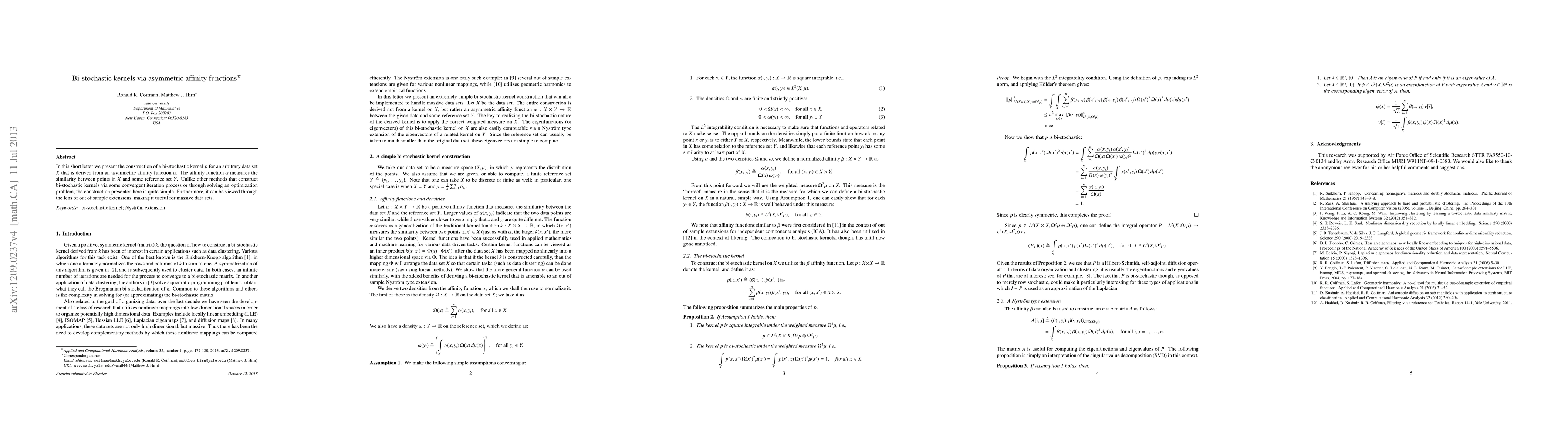The research presents a simple construction of a bi-stochastic kernel p for an arbitrary data set X derived from an asymmetric affinity function α.