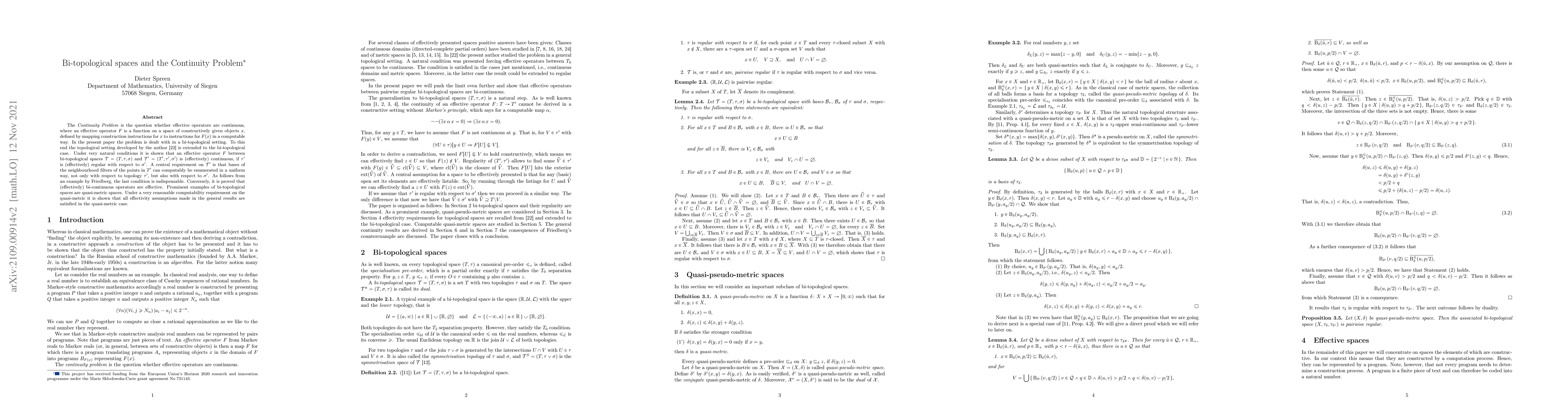 The \emph{Continuity Problem} is the question whether effective operators are continuous, where an effective operator $F$ is a function on a space of constructively given objects $x$, defined by mapping construction instructions for $x$ to instructions for $F(x)$ in a computable way. In the present paper the problem is dealt with in a bi-topological setting. To this end the topological setting developed by the author \cite{sp} is extended to the bi-topological case. Under very natural conditions it is shown that an effective operator $F$ between bi-topological spaces $\TTT = (T, \tau, \sigma)$ and $\TTT' = (T', \tau', \sigma')$ is (effectively) continuous, if $\tau'$ is (effectively) regular with respect to $\sigma'$. A central requirement on $\TTT'$ is that bases of the neighbourhood filters of the points in $T'$ can computably be enumerated in a uniform way, not only with respect to topology $\tau'$, but also with respect to $\sigma'$. As follows from an example by Friedberg, the last condition is indispensable. Conversely, it is proved that (effectively) bi-continuous operators are effective. A prominent example of bi-topological spaces are quasi-metric spaces. Under a very reasonable computability requirement on the quasi-metric it is shown that all effectivity assumptions made in the general results are satisfied in the quasi-metric case.