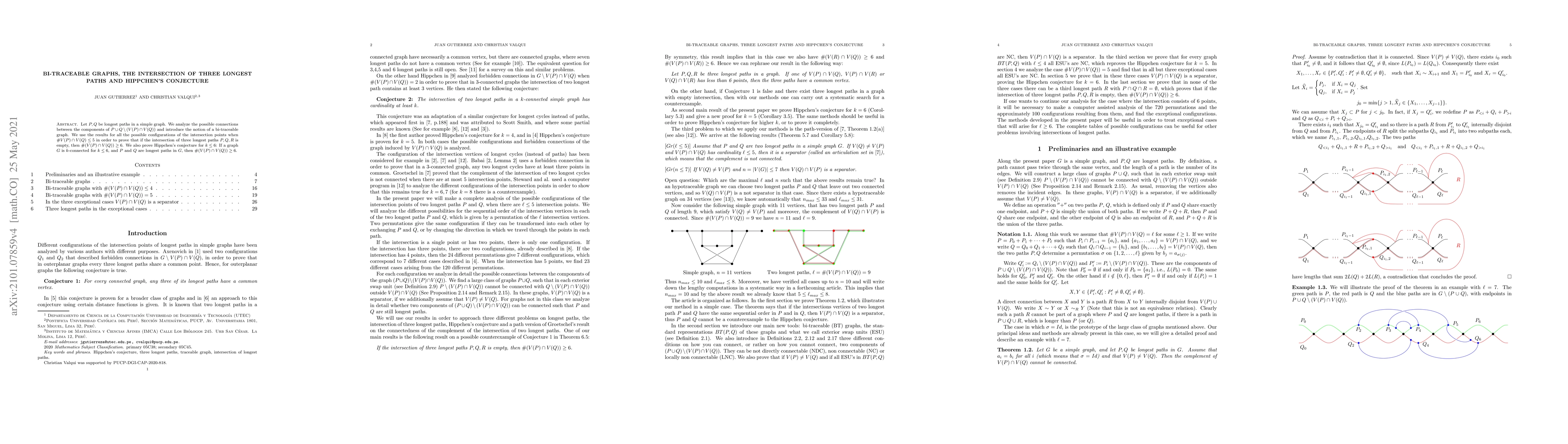 Let $P,Q$ be longest paths in a simple graph. We analyze the possible connections between the components of $P\cup Q\setminus (V(P)\cap V(Q))$ and introduce the notion of a bi-traceable graph. We use the results for all the possible configurations of the intersection points when $\#V(P)\cap V(Q)\le 5$ in order to prove that if the intersection of three longest paths $P,Q,R$ is empty, then $\#(V(P)\cap V(Q))\ge 6$. We also prove Hippchen's conjecture for $k\le 6$: If a graph $G$ is $k$-connected for $k\le 6$, and $P$ and $Q$ are longest paths in $G$, then $\#(V(P)\cap V(Q))\ge 6$.