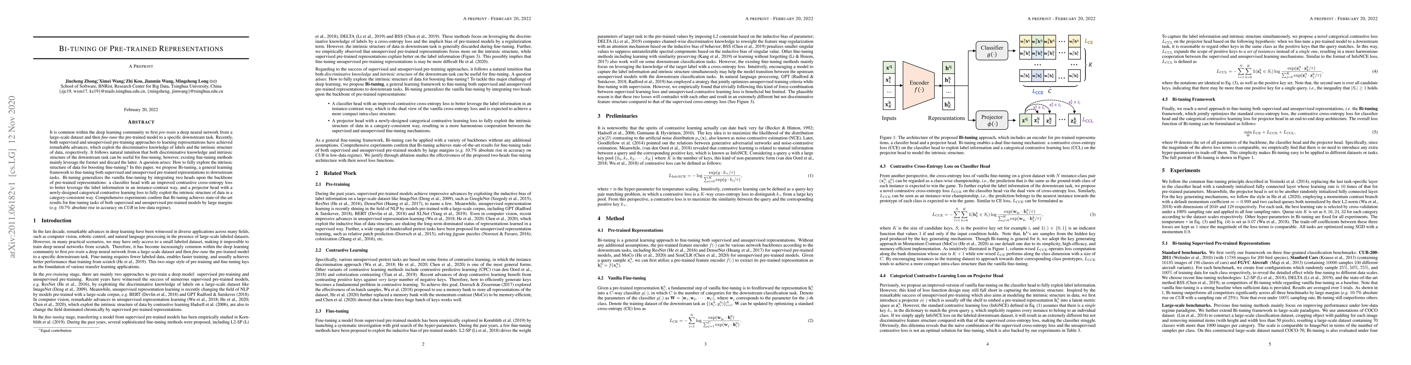 This paper introduces Bi-tuning, a framework that fine-tunes both supervised and unsupervised pre-trained representations by integrating two heads: a classifier head with an improved contrastive loss and a projector head with a categorical contrastive learning loss, achieving state-of-the-art results in fine-tuning tasks.