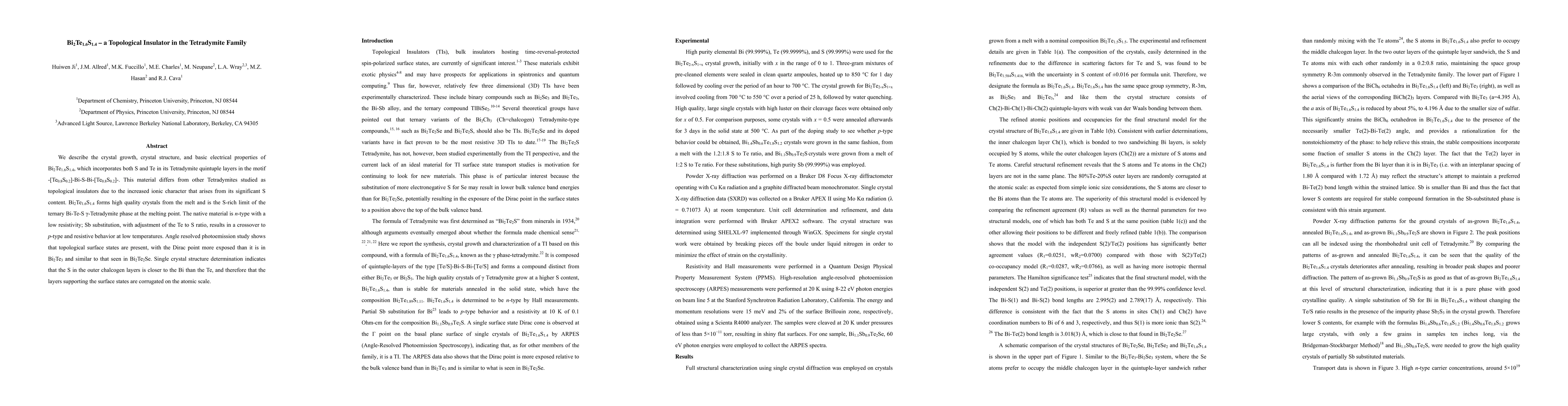 Bi2Te1.6S1.4, a topological insulator in the tetradymite family, exhibits increased ionic character due to its significant sulfur content, leading to unique electrical properties and topological surface states. The material forms high-quality crystals and shows a transition from n-type to p-type with Sb substitution.