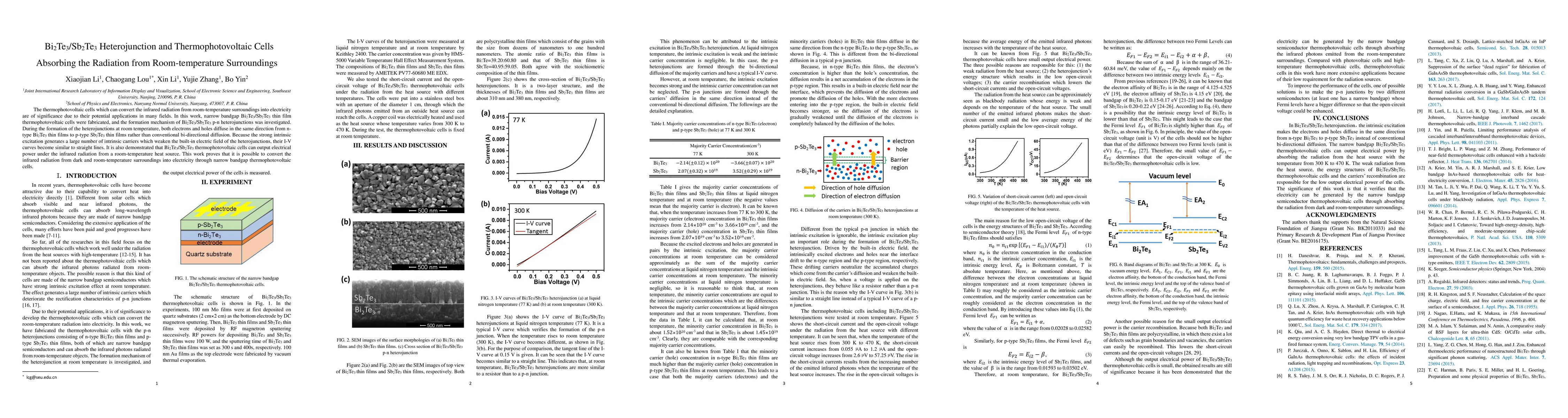 This paper investigates the fabrication and mechanism of Bi2Te3/Sb2Te3 thermophotovoltaic cells, demonstrating their ability to convert infrared radiation from room-temperature surroundings into electricity, with unique heterojunction formation and power output under ambient infrared radiation.