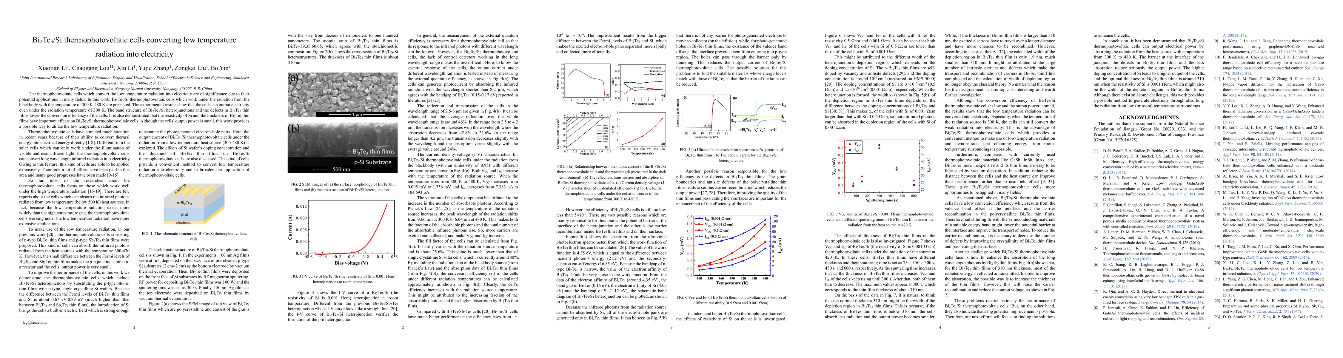 This paper presents Bi2Te3/Si thermophotovoltaic cells that convert low-temperature radiation into electricity, showing functionality even at 300 K. Factors like the band structure and defects in Bi2Te3, as well as Si resistivity and Bi2Te3 film thickness, impact conversion efficiency, though the output power remains small.