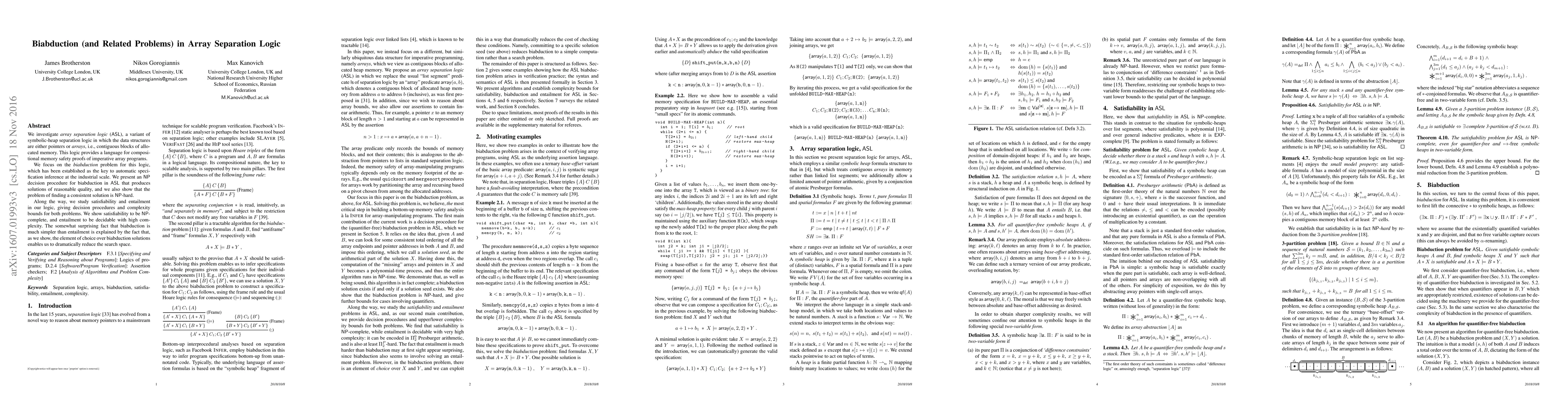 We investigate array separation logic (ASL), a variant of symbolic-heap separation logic in which the data structures are either pointers or arrays, i.e., contiguous blocks of allocated memory. This logic provides a language for compositional memory safety proofs of imperative array programs. We focus on the biabduction problem for this logic, which has been established as the key to automatic specification inference at the industrial scale. We present an NP decision procedure for biabduction in ASL that produces solutions of reasonable quality, and we also show that the problem of finding a consistent solution is NP-hard. Along the way, we study satisfiability and entailment in our logic, giving decision procedures and complexity bounds for both problems. We show satisfiability to be NP-complete, and entailment to be decidable with high complexity. The somewhat surprising fact that biabduction is much simpler than entailment is explained by the fact that, as we show, the element of choice over biabduction solutions enables us to dramatically reduce the search space.