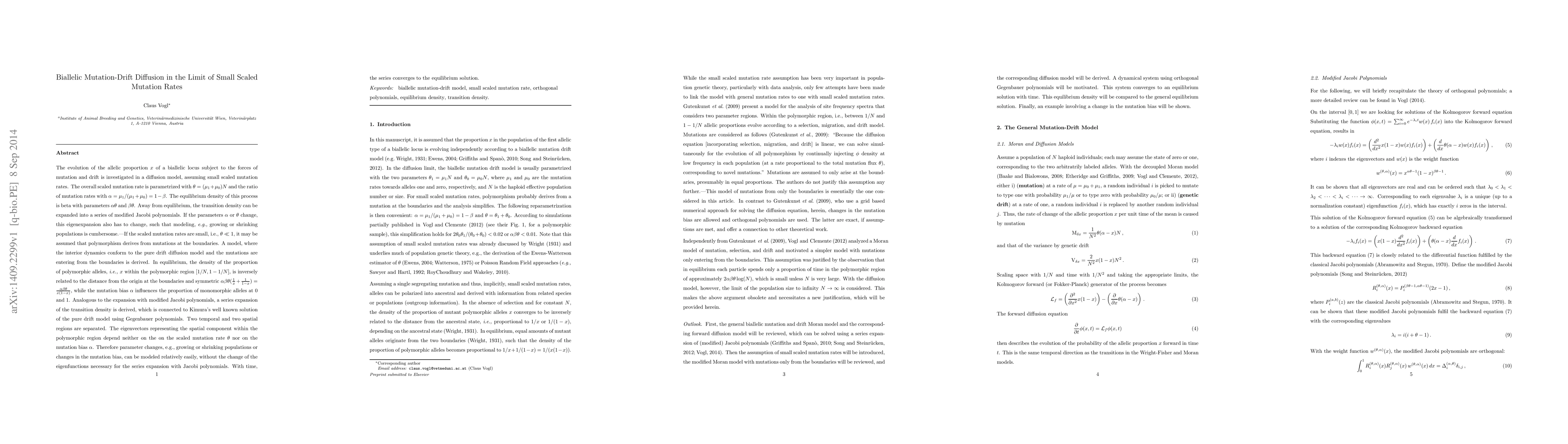 This paper explores the evolution of allelic proportions under mutation and drift in a biallelic locus, focusing on small scaled mutation rates. The study derives a diffusion model where polymorphism arises from boundary mutations, and provides a series expansion for transition densities connected to Kimura's pure drift model.
