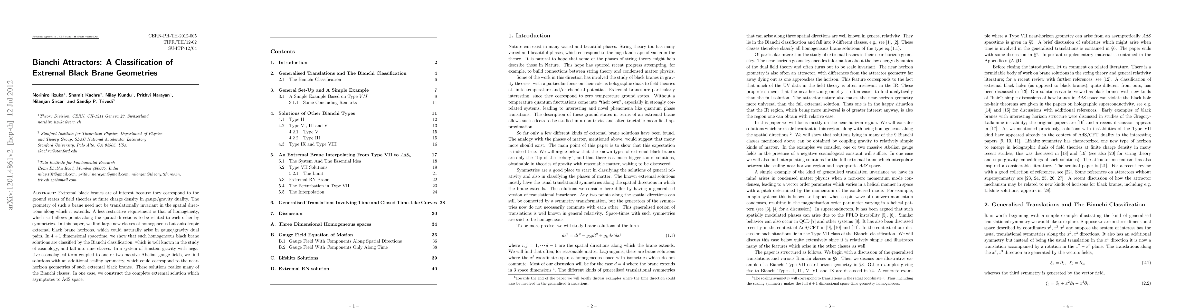 This paper classifies new homogeneous but anisotropic extremal black brane geometries in 4+1 dimensions, showing they fall into nine distinct Bianchi classes. It also identifies solutions with scaling symmetry in Einstein gravity coupled to massive Abelian gauge fields, constructing a complete extremal solution asymptoting to AdS space.