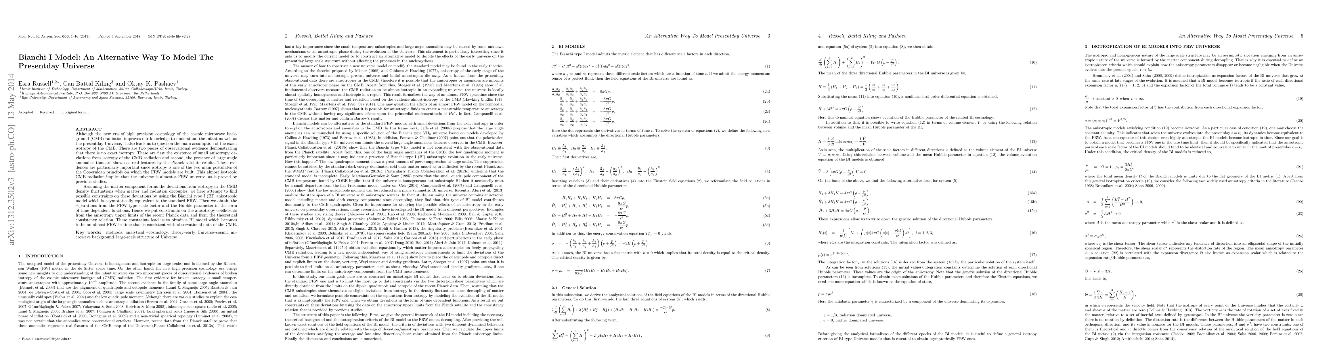 Although the new era of high precision cosmology of the cosmic microwave background (CMB) radiation improves our knowledge to understand the infant as well as the presentday Universe, it also leads us to question the main assumption of the exact isotropy of the CMB. There are two pieces of observational evidence that hint towards there being no exact isotropy. These are first the existence of small anisotropy deviations from isotropy of the CMB radiation and second, the presence of large angle anomalies, although the existence of these anomalies is currently a huge matter of debate. These hints are particularly important since isotropy is one of the two main postulates of the Copernican principle on which the FRW models are built. This almost isotropic CMB radiation implies that the universe is almost a FRW universe, as is proved by previous studies. Assuming the matter component forms the deviations from isotropy in the CMB density fluctuations when matter and radiation decouples, we here attempt to find possible constraints on the FRW type scale and Hubble parameter by using the Bianchi type I (BI) anisotropic model which is asymptotically equivalent to the standard FRW. To obtain constraints on such an anisotropic model, we derive average and late-time shear values that come from the anisotropy upper limits of the recent Planck data based on a model independent shear parameter of Maartens et al. (1995a,b) and from the theoretical consistency relation. These constraints lead us to obtain a BI model which becomes an almost-FRW model in time, and which is consistent with the latest observational data of the CMB.