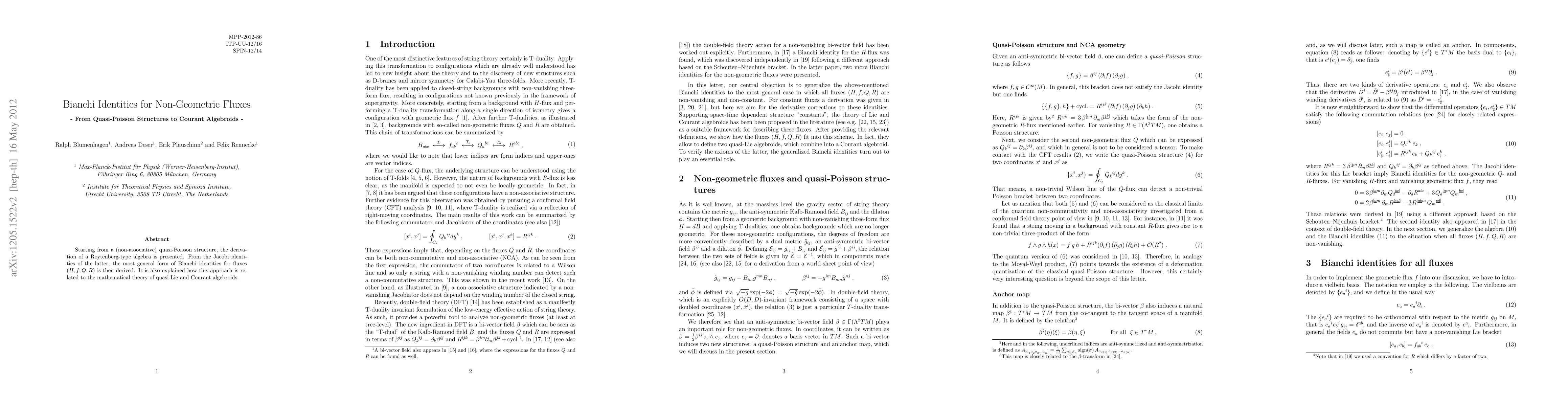 This paper derives Bianchi identities for non-geometric fluxes starting from quasi-Poisson structures and shows their connection to quasi-Lie and Courant algebroids, establishing a Roytenberg-type algebra from the Jacobi identities.