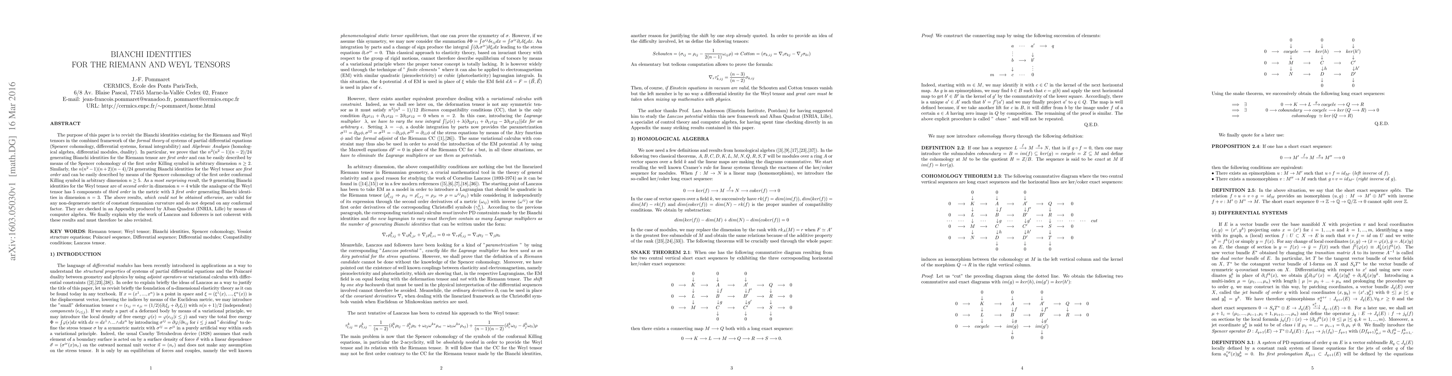 The purpose of this paper is to revisit the Bianchi identities existing for the Riemann and Weyl tensors in the combined framework of the formal theory of systems of partial differential equations (Spencer cohomology, differential systems, formal integrability) and Algebraic Analysis (homological algebra, differential modules, duality). In particular, we prove that the n 2 (n 2 -- 1)(n -- 2)/24 generating Bianchi identities for the Riemann tensor are first order and can be easily described by means of the Spencer cohomology of the first order Killing symbol in arbitrary dimension n $\ge$ 2. Similarly, the n(n 2 -- 1)(n + 2)(n -- 4)/24 generating Bianchi identities for the Weyl tensor are first order and can be easily described by means of the Spencer cohomology of the first order conformal Killing symbol in arbitrary dimension n $\ge$ 5. As A MOST SURPRISING RESULT, the 9 generating Bianchi identities for the Weyl tensor are of second order in dimension n = 4 while the analogue of the Weyl tensor has 5 components of third order in the metric with 3 first order generating Bianchi identities in dimension n = 3. The above results, which could not be obtained otherwise, are valid for any non-degenerate metric of constant riemannian curvature and do not depend on any conformal factor. They are checked in an Appendix produced by Alban Quadrat (INRIA, Lille) by means of computer algebra. We finally explain why the work of Lanczos and followers is not coherent with these results and must therefore be also revisited.