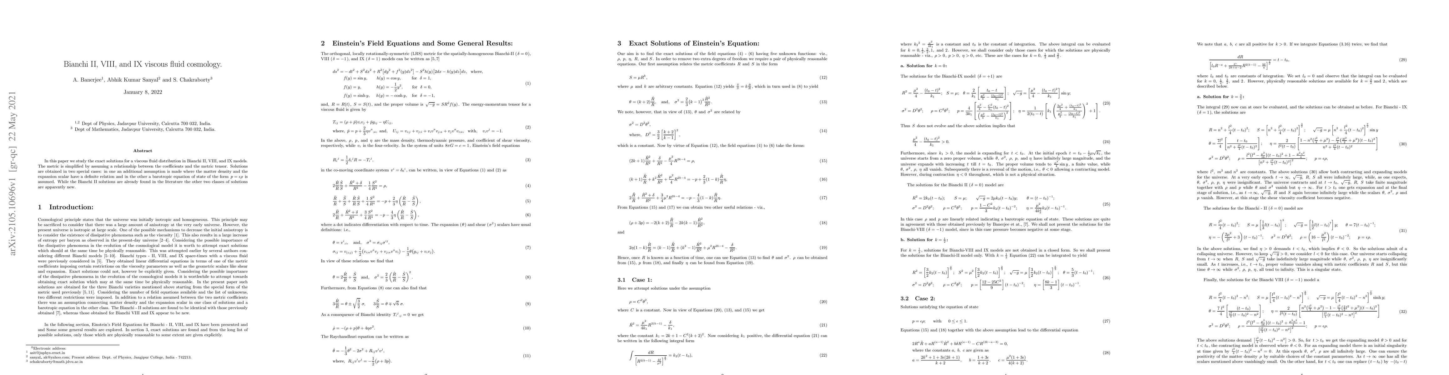 This paper explores exact solutions for viscous fluid distributions in Bianchi II, VIII, and IX cosmological models, deriving new solutions for the latter two under specific assumptions about matter density and expansion scalar relations. The study simplifies the metric by linking coefficients to the metric tensor.