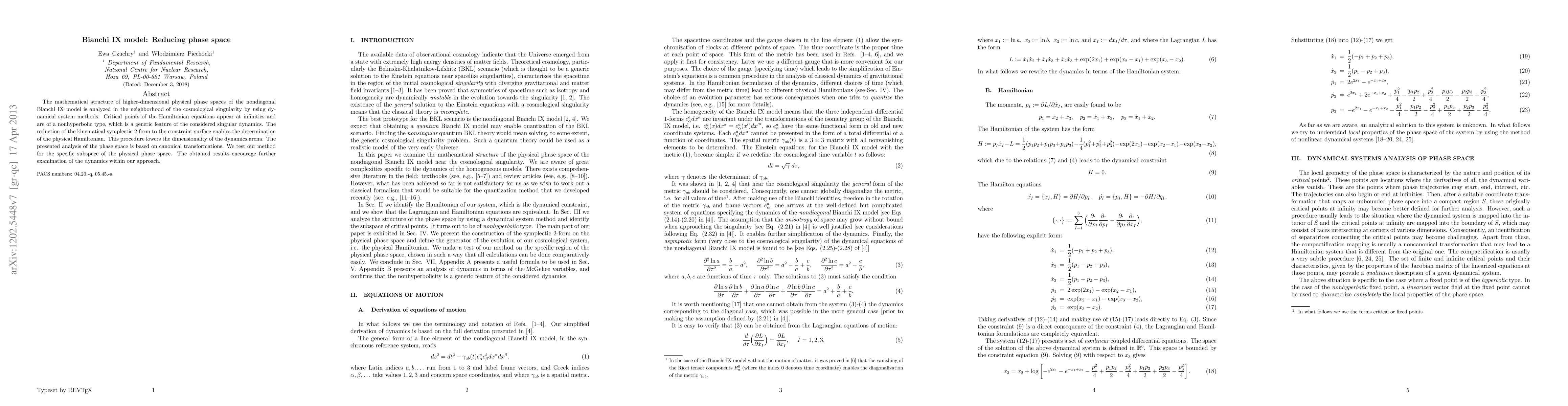 This paper analyzes the higher-dimensional phase space of the Bianchi IX model near a cosmological singularity using dynamical systems methods, identifying nonhyperbolic critical points. It employs canonical transformations to reduce the phase space dimensionality, determining the physical Hamiltonian, and tests the method on a specific subspace, showing promising results for further study.