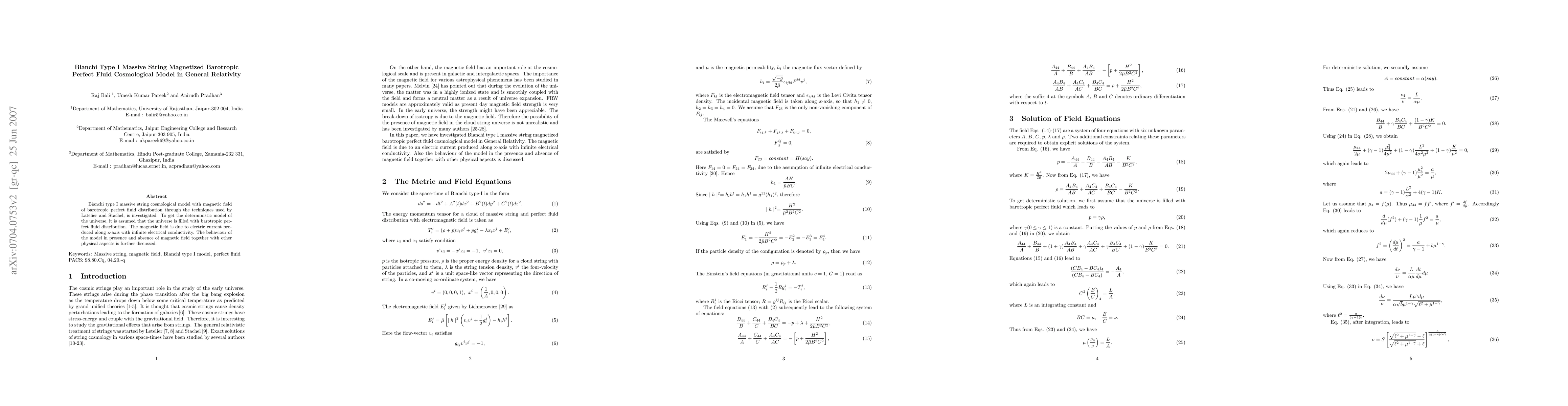 This paper investigates a Bianchi type I cosmological model filled with a barotropic perfect fluid, massive strings, and a magnetic field, using methods from Latelier and Stachel. It examines the universe's behavior with and without the magnetic field, considering infinite electrical conductivity along the x-axis.