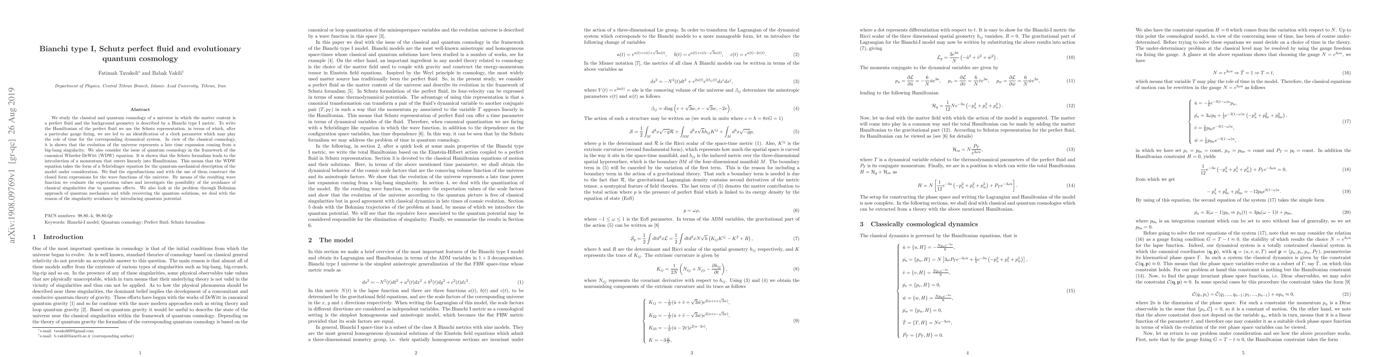 This paper explores the classical and quantum cosmology of a Bianchi type I universe filled with a Schutz perfect fluid, revealing late-time expansion from a big-bang singularity. It utilizes the canonical Wheeler-DeWitt equation to find wave functions and investigate singularity avoidance via quantum potential in the Bohmian approach.