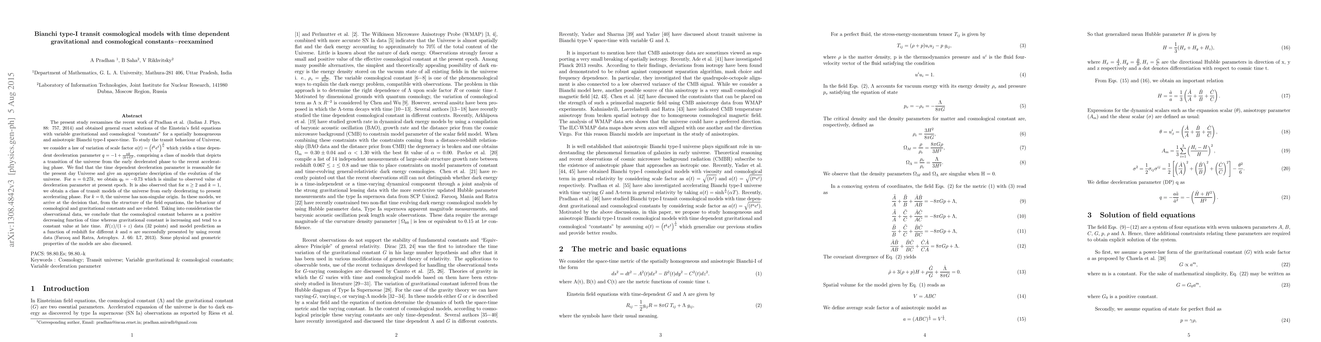 The present study reexamines the recent work of Pradhan et al. (Indian J. Phys. 88: 757, 2014) and obtained general exact solutions of the Einstein's field equations with variable gravitational and cosmological "constants" for a spatially homogeneous and anisotropic Bianchi type-I space-time. To study the transit behaviour of Universe, we consider a law of variation of scale factor $a(t) = \left(t^{k} e^{t}\right)^{\frac{1}{n}}$ which yields a time dependent deceleration parameter $q = - 1 + \frac{nk}{(k + t)^{2}}$, comprising a class of models that depicts a transition of the universe from the early decelerated phase to the recent accelerating phase. We find that the time dependent deceleration parameter is reasonable for the present day Universe and give an appropriate description of the evolution of the universe. For $n = 0.27k$, we obtain $q_{0} = -0.73$ which is similar to observed value of deceleration parameter at present epoch. It is also observed that for $n \geq 2$ and $k = 1$, we obtain a class of transit models of the universe from early decelerating to present accelerating phase. For $k = 0$, the universe has non-singular origin. In these models, we arrive at the decision that, from the structure of the field equations, the behaviour of cosmological and gravitational constants and are related. Taking into consideration the observational data, we conclude that the cosmological constant behaves as a positive decreasing function of time whereas gravitational constant is increasing and tend to a constant value at late time. $H(z)/(1+z)$ data ($32$ points) and model prediction as a function of redshift for different $k$ and $n$ are successfully presented by using recent data (Farooq and Ratra, Astrophys. J. 66: L7, 2013). Some physical and geometric properties of the models are also discussed.