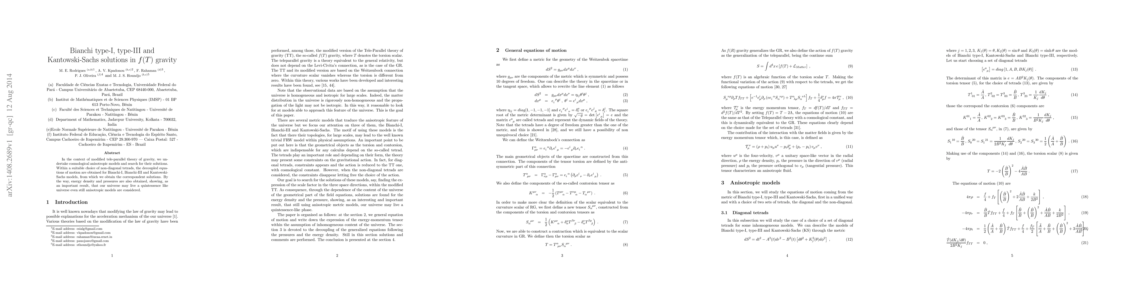 In the context of modified tele-parallel theory of gravity, we undertake cosmological anisotropic models and search for their solutions. Within a suitable choice of non-diagonal tetrads, the decoupled equations of motion are obtained for Bianchi-I, Bianchi-III and Kantowski-Sachs models, from which we obtain the correspondent solutions. By the way, energy density and pressures are also obtained, showing, as an important result, that our universe may live a quintessence like universe even still anisotropic models are considered.