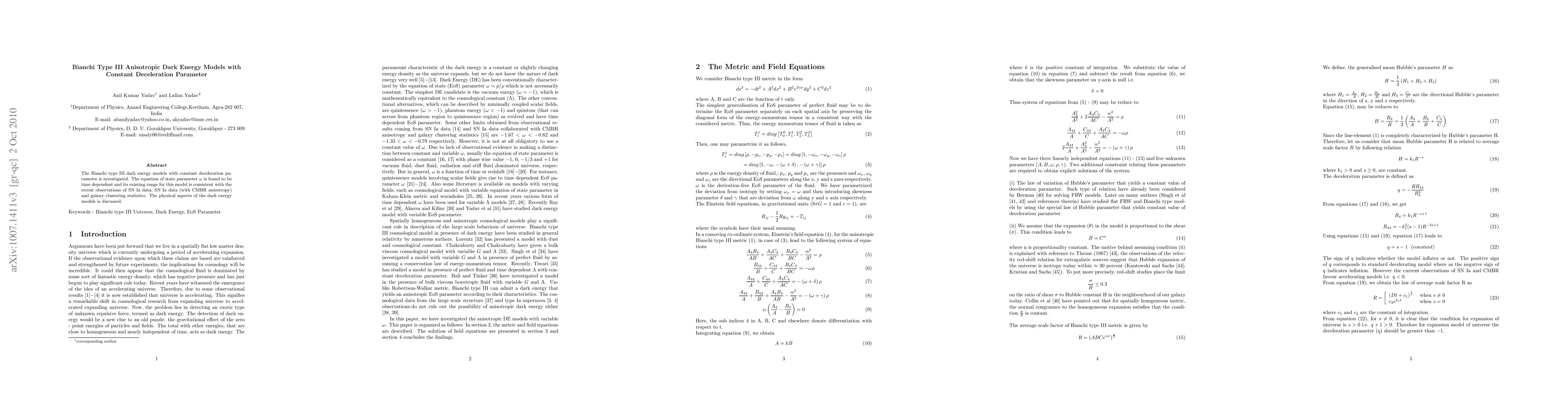 This paper explores Bianchi type III anisotropic dark energy models with a constant deceleration parameter, finding that the equation of state parameter $\omega$ is time-dependent and aligns with recent observational data from SN Ia, CMBR anisotropy, and galaxy clustering. The study also discusses the physical implications of these models.