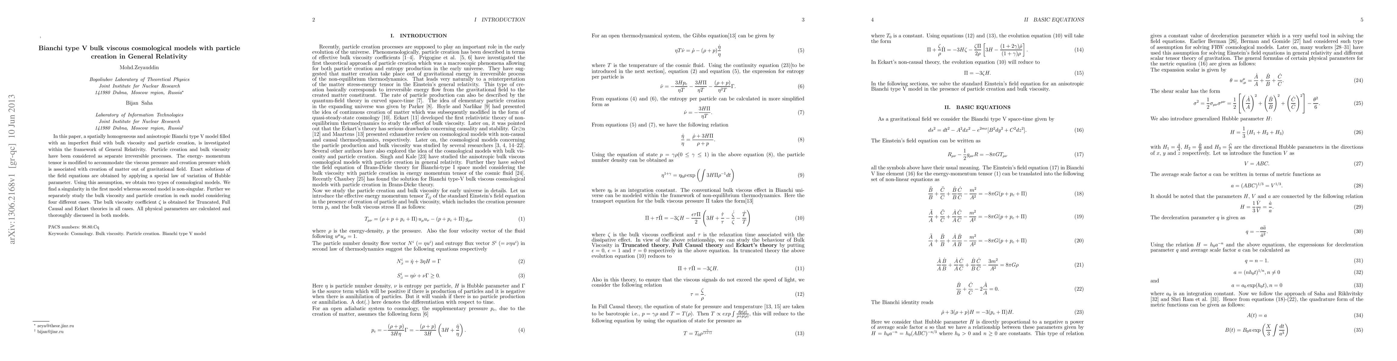 In this paper, a spatially homogeneous and anisotropic Bianchi type V model filled with an imperfect fluid with bulk viscosity and particle creation, is investigated within the framework of General Relativity. Particle creation and bulk viscosity have been considered as separate irreversible processes. The energy- momentum tensor is modified to accommodate the viscous pressure and creation pressure which is associated with creation of matter out of gravitational field. Exact solutions of the field equations are obtained by applying a special law of variation of Hubble parameter. Using this assumption, we obtain two types of cosmological models. We find a singularity in the first model whereas second model is non-singular. Further we separately study the bulk viscosity and particle creation in each model considering four different cases. The bulk viscosity coefficient $\zeta$ is obtained for Truncated, Full Causal and Eckart theories in all cases. All physical parameters are calculated and thoroughly discussed in both models.