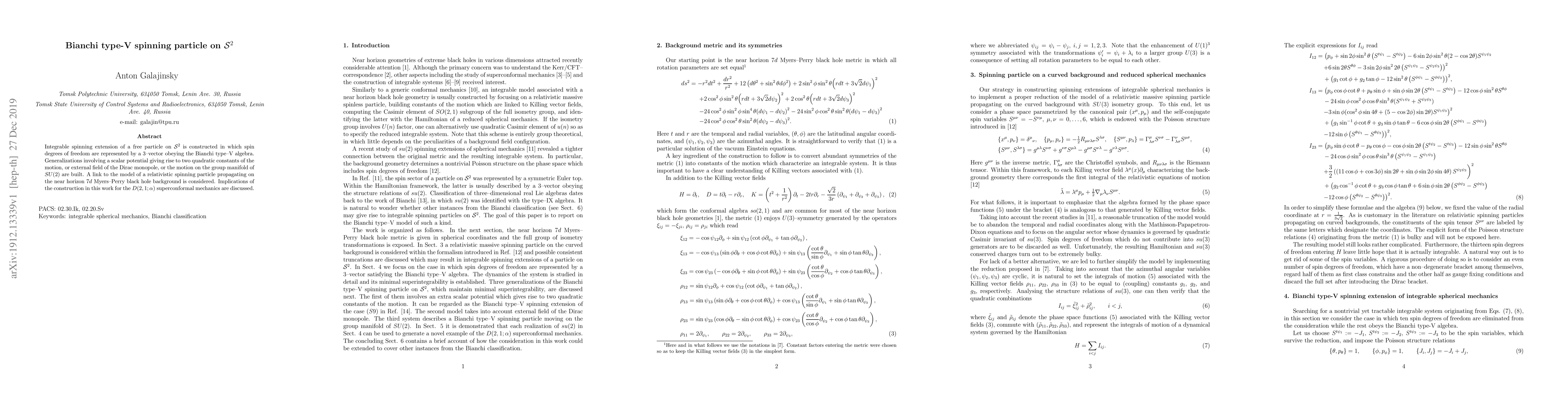 This paper constructs an integrable model of a spinning particle on a 2-sphere, where spin degrees of freedom follow the Bianchi type-V algebra. It extends the model to include scalar potentials, Dirac monopole fields, and SU(2) group manifold dynamics, and links it to relativistic spinning particles near a 7d black hole horizon, with implications for D(2,1;a) superconformal mechanics.