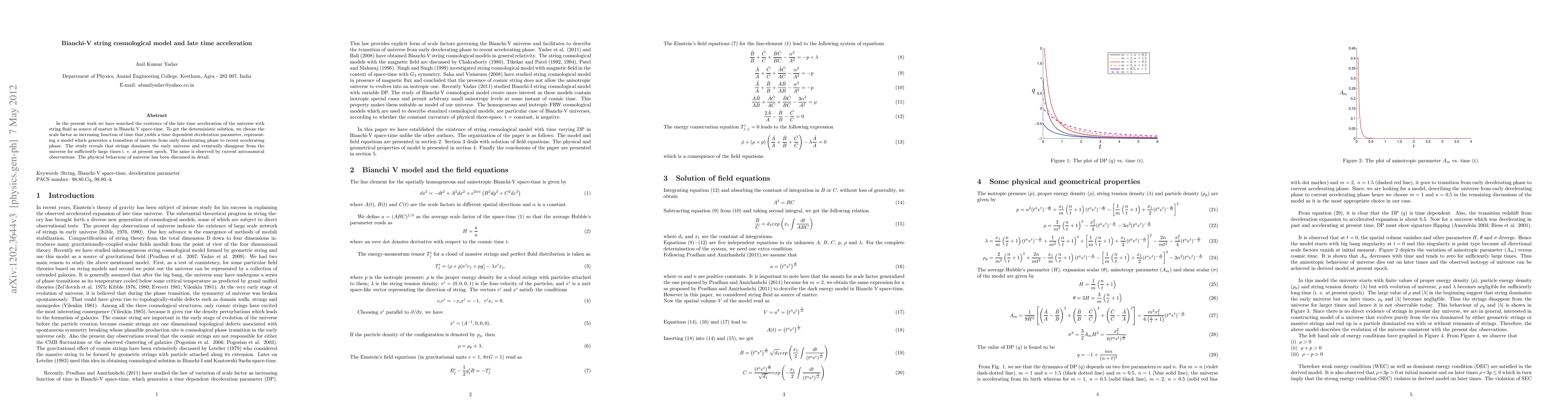 In the present work we have searched the existence of the late time acceleration of the universe with string fluid as source of matter in Bianchi V space-time. To get the deterministic solution, we choose the scale factor as increasing function of time that yields a time dependent deceleration parameter, representing a model which generates a transition of universe from early decelerating phase to recent accelerating phase. The study reveals that strings dominate the early universe and eventually disappear from the universe for sufficiently large times i. e. at present epoch. The same is observed by current astronomical observations. The physical behaviour of universe has been discussed in detail.