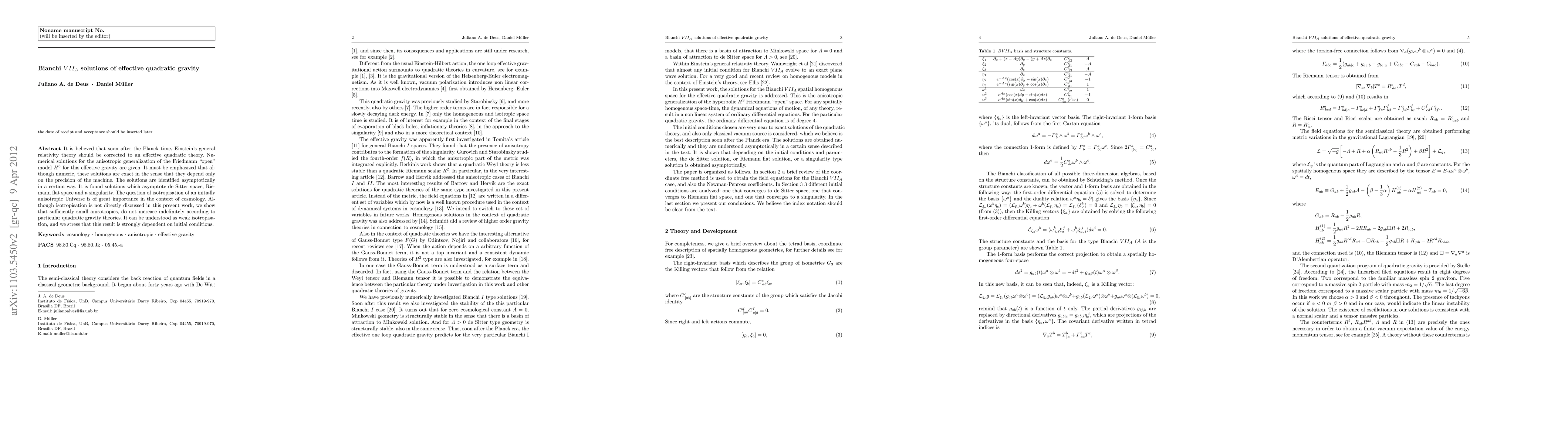 It is believed that soon after the Planck time, Einstein's general relativity theory should be corrected to an effective quadratic theory. Numerical solutions for the anisotropic generalization of the Friedmann "open" model $H^ 3$ for this effective gravity are given. It must be emphasized that although numeric, these solutions are exact in the sense that they depend only on the precision of the machine. The solutions are identified asymptotically in a certain way. It is found solutions which asymptote de Sitter space, Riemann flat space and a singularity. The question of isotropisation of an initially anisotropic Universe is of great importance in the context of cosmology. Although isotropisation is not directly discussed in this present work, we show that sufficiently small anisotropies, do not increase indefinitely according to particular quadratic gravity theories. It can be understood as weak isotropisation, and we stress that this result is strongly dependent on initial conditions.