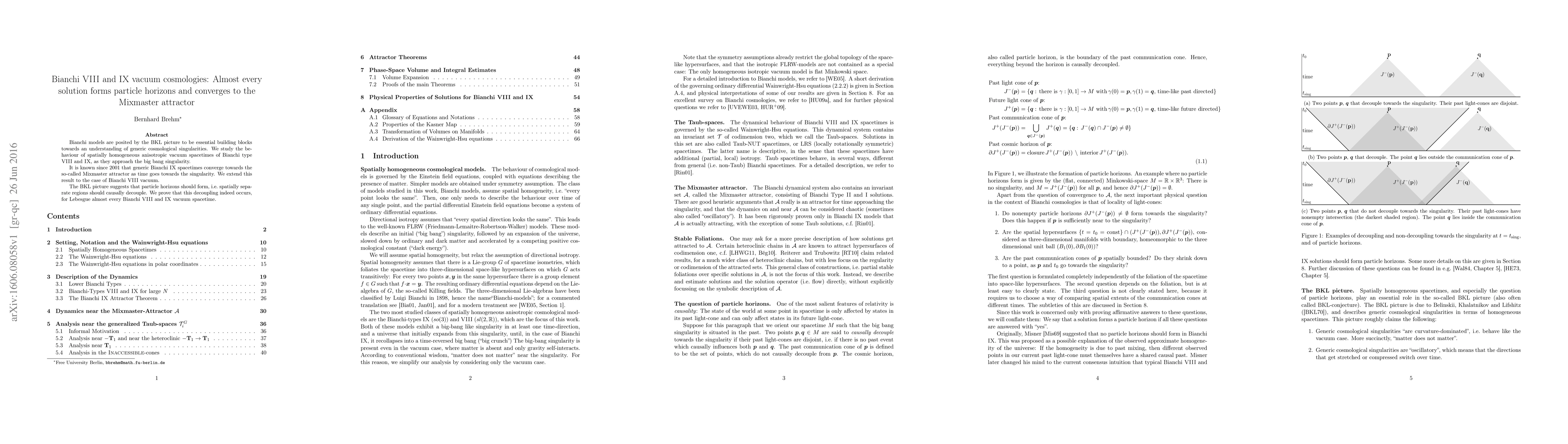 This paper investigates the behavior of Bianchi VIII and IX vacuum cosmologies near the big bang singularity, showing that almost every solution forms particle horizons and converges to the Mixmaster attractor, extending previous findings for Bianchi IX to Bianchi VIII.
