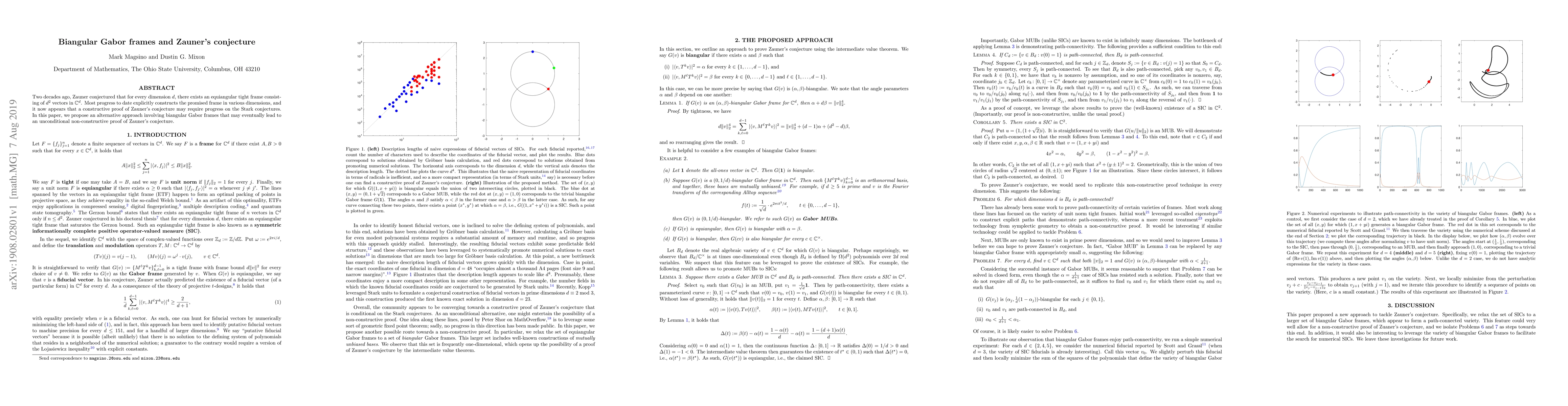 Two decades ago, Zauner conjectured that for every dimension $d$, there exists an equiangular tight frame consisting of $d^2$ vectors in $\mathbb{C}^d$. Most progress to date explicitly constructs the promised frame in various dimensions, and it now appears that a constructive proof of Zauner's conjecture may require progress on the Stark conjectures. In this paper, we propose an alternative approach involving biangular Gabor frames that may eventually lead to an unconditional non-constructive proof of Zauner's conjecture.