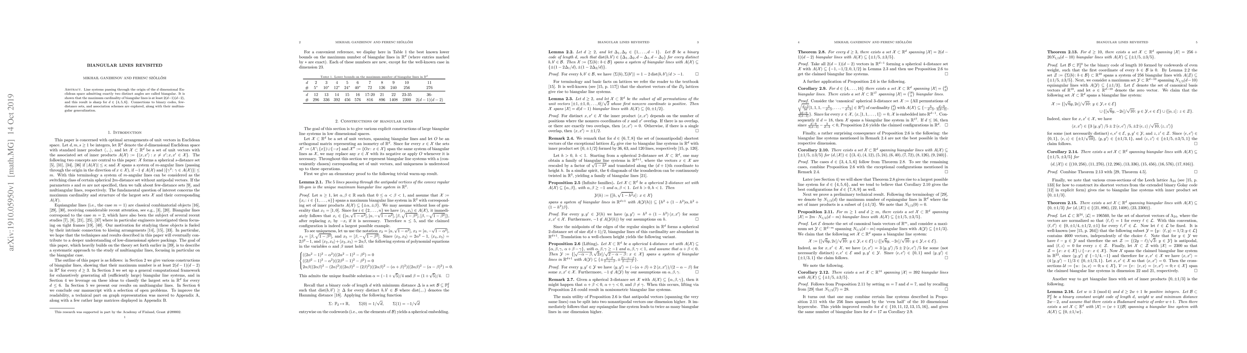 Line systems passing through the origin of the $d$ dimensional Euclidean space admitting exactly two distinct angles are called biangular. It is shown that the maximum cardinality of biangular lines is at least $2(d-1)(d-2)$, and this result is sharp for $d\in\{4,5,6\}$. Connections to binary codes, few-distance sets, and association schemes are explored, along with their multiangular generalization.