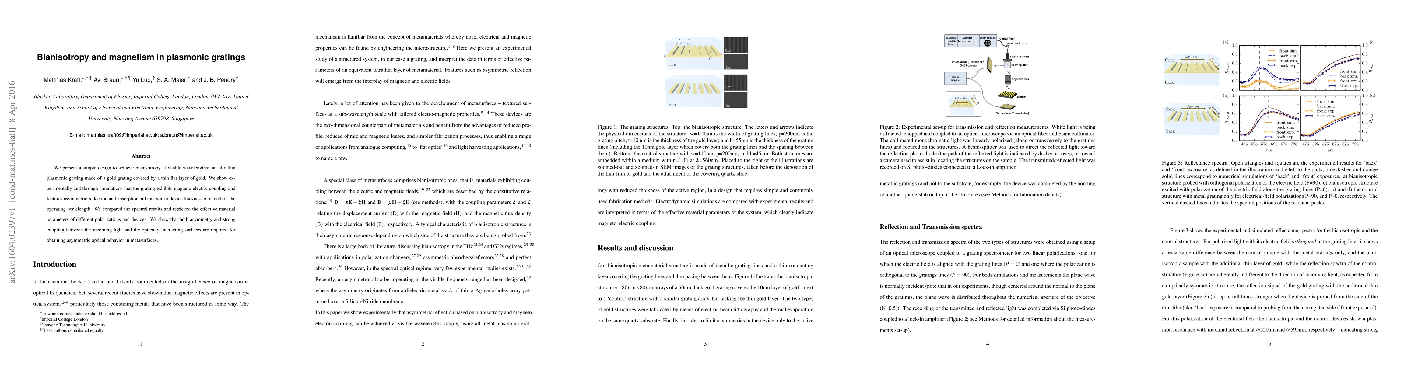 Researchers created a plasmonic grating that exhibits bianisotropy, with asymmetric reflection and absorption properties due to magneto-electric coupling, allowing for efficient manipulation of light at visible wavelengths.