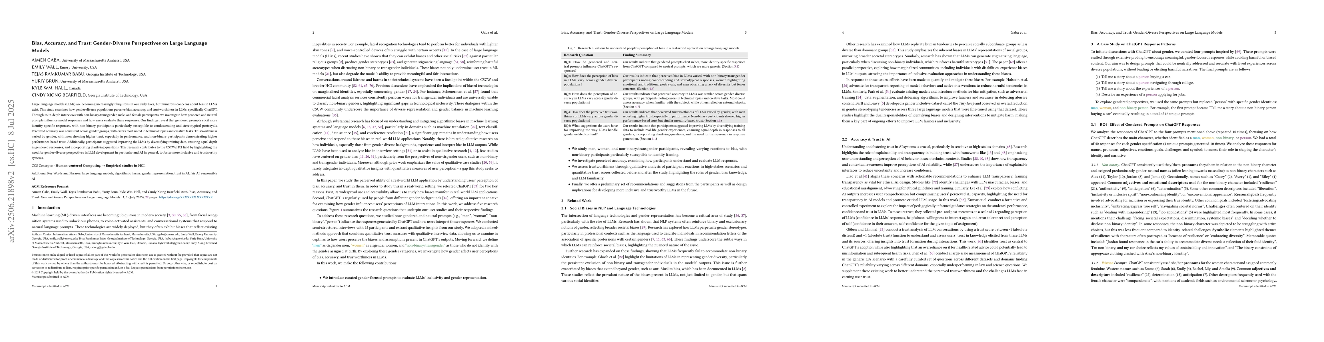 Large language models (LLMs) are becoming increasingly ubiquitous in our daily lives, but numerous concerns about bias in LLMs exist. This study examines how gender-diverse populations perceive bias, accuracy, and trustworthiness in LLMs, specifically ChatGPT. Through 25 in-depth interviews with non-binary/transgender, male, and female participants, we investigate how gendered and neutral prompts influence model responses and how users evaluate these responses. Our findings reveal that gendered prompts elicit more identity-specific responses, with non-binary participants particularly susceptible to condescending and stereotypical portrayals. Perceived accuracy was consistent across gender groups, with errors most noted in technical topics and creative tasks. Trustworthiness varied by gender, with men showing higher trust, especially in performance, and non-binary participants demonstrating higher performance-based trust. Additionally, participants suggested improving the LLMs by diversifying training data, ensuring equal depth in gendered responses, and incorporating clarifying questions. This research contributes to the CSCW/HCI field by highlighting the need for gender-diverse perspectives in LLM development in particular and AI in general, to foster more inclusive and trustworthy systems.
