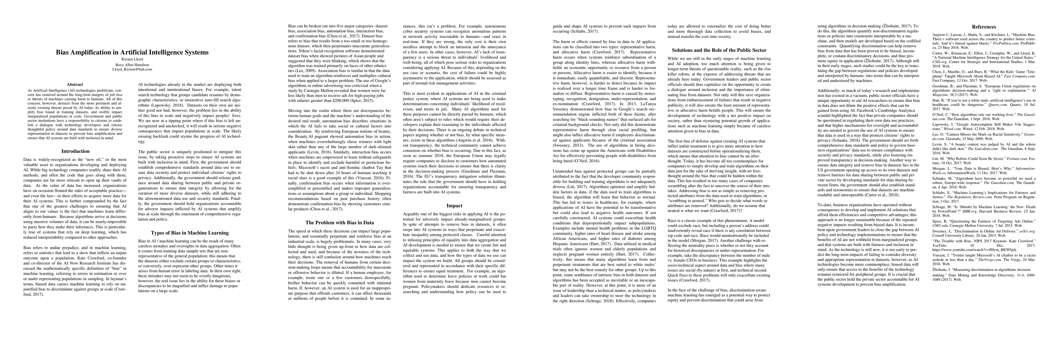 As Artificial Intelligence (AI) technologies proliferate, concern has centered around the long-term dangers of job loss or threats of machines causing harm to humans. All of this concern, however, detracts from the more pertinent and already existing threats posed by AI today: its ability to amplify bias found in training datasets, and swiftly impact marginalized populations at scale. Government and public sector institutions have a responsibility to citizens to establish a dialogue with technology developers and release thoughtful policy around data standards to ensure diverse representation in datasets to prevent bias amplification and ensure that AI systems are built with inclusion in mind.