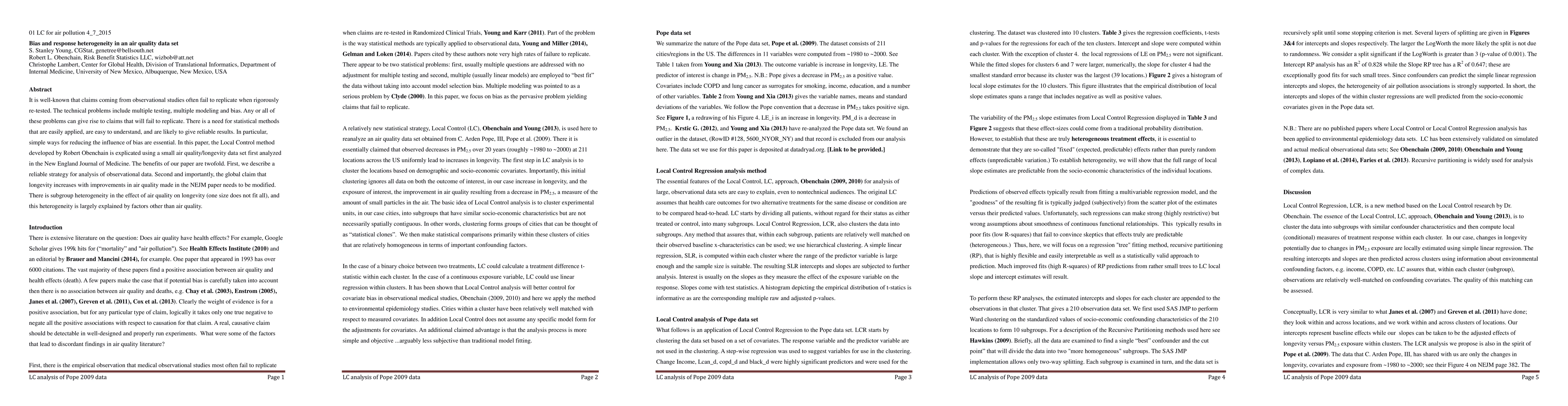 It is well-known that claims coming from observational studies often fail to replicate when rigorously re-tested. The technical problems include multiple testing, multiple modeling and bias. Any or all of these problems can give rise to claims that will fail to replicate. There is a need for statistical methods that are easily applied, are easy to understand, and are likely to give reliable results. In particular, simple ways for reducing the influence of bias are essential. In this paper, the Local Control method developed by Robert Obenchain is explicated using a small air quality/longevity data set first analyzed in the New England Journal of Medicine. The benefits of our paper are twofold. First, we describe a reliable strategy for analysis of observational data. Second and importantly, the global claim that longevity increases with improvements in air quality made in the NEJM paper needs to be modified. There is subgroup heterogeneity in the effect of air quality on longevity (one size does not fit all), and this heterogeneity is largely explained by factors other than air quality.
