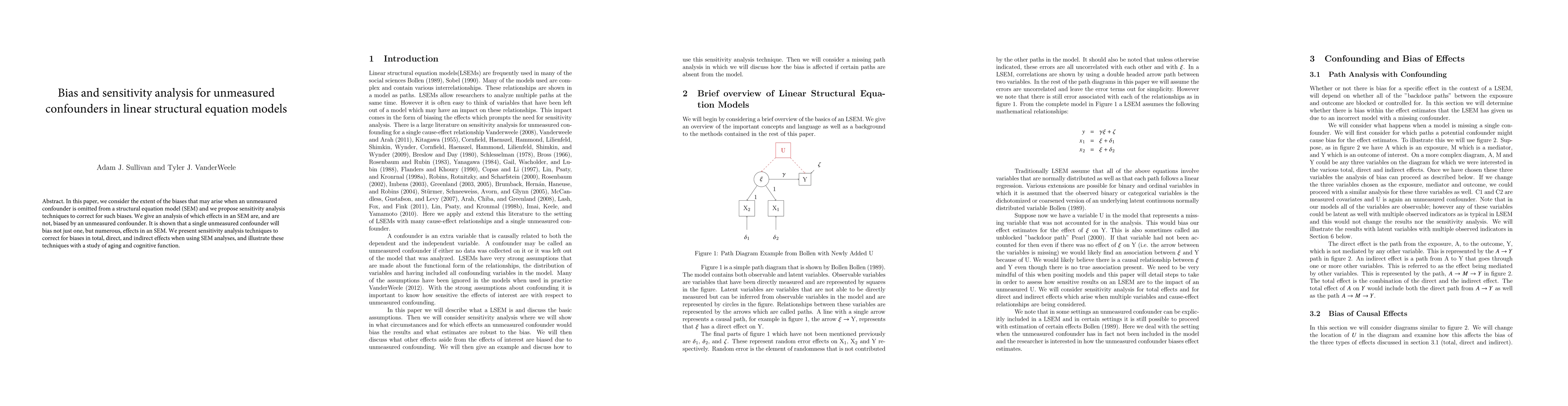 In this paper, we consider the extent of the biases that may arise when an unmeasured confounder is omitted from a structural equation model (SEM) and we propose sensitivity analysis techniques to correct for such biases. We give an analysis of which effects in an SEM are, and are not, biased by an unmeasured confounder. It is shown that a single unmeasured confounder will bias not just one, but numerous, effects in an SEM. We present sensitivity analysis techniques to correct for biases in total, direct, and indirect effects when using SEM analyses, and illustrate these techniques with a study of aging and cognitive function.