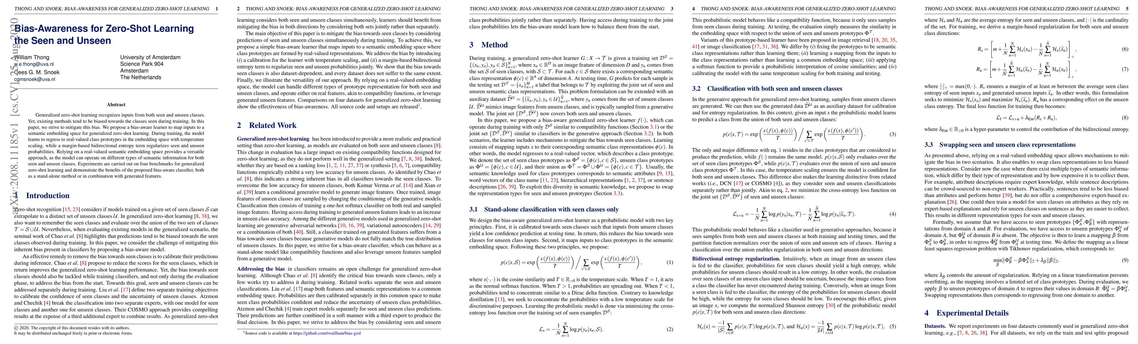 This paper proposes a bias-aware learner for generalized zero-shot learning to mitigate bias towards seen classes. It employs a semantic embedding space with temperature scaling and a margin-based entropy term to balance seen and unseen class probabilities, demonstrating improved performance on four benchmarks.