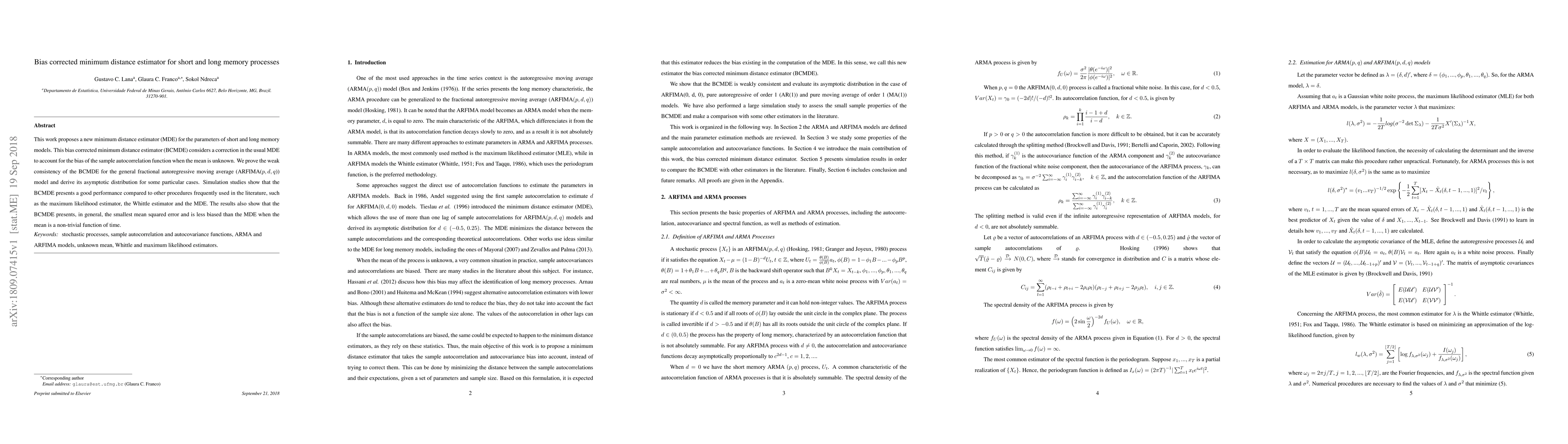 This paper introduces a bias corrected minimum distance estimator (BCMDE) for short and long memory processes, demonstrating its weak consistency and asymptotic distribution. Simulation results indicate that the BCMDE outperforms other estimators, including the maximum likelihood and Whittle estimators, in terms of mean squared error and bias reduction.