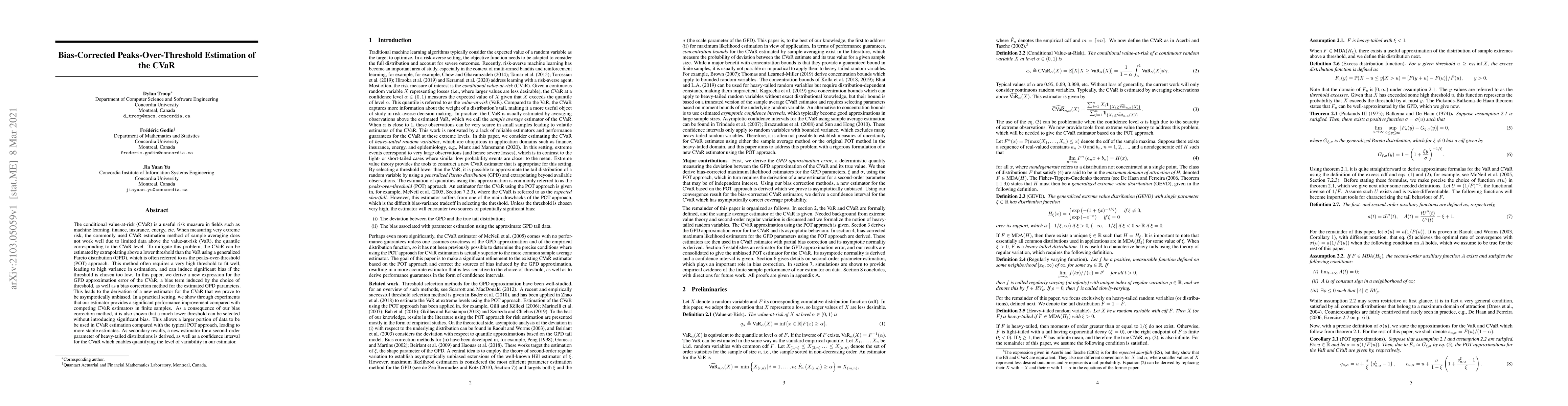 This paper proposes a bias-corrected peaks-over-threshold (POT) method for estimating the conditional value-at-risk (CVaR), addressing the limitations of traditional methods in extreme risk scenarios. The authors derive a new estimator that is asymptotically unbiased and demonstrate improved performance in finite samples, allowing for the use of a lower threshold without significant bias.