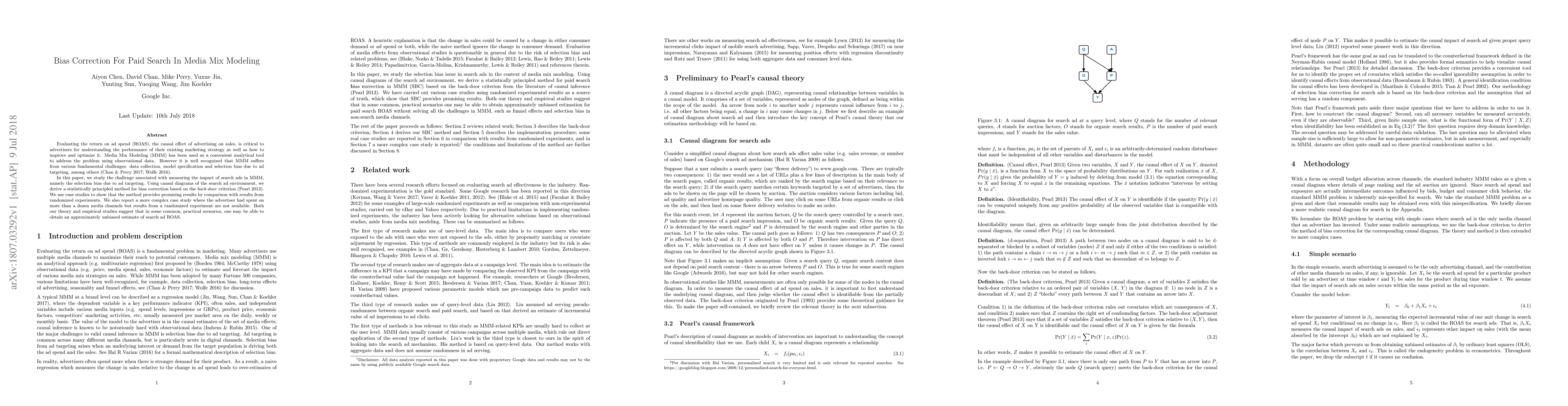 Evaluating the return on ad spend (ROAS), the causal effect of advertising on sales, is critical to advertisers for understanding the performance of their existing marketing strategy as well as how to improve and optimize it. Media Mix Modeling (MMM) has been used as a convenient analytical tool to address the problem using observational data. However it is well recognized that MMM suffers from various fundamental challenges: data collection, model specification and selection bias due to ad targeting, among others \citep{chan2017,wolfe2016}. In this paper, we study the challenge associated with measuring the impact of search ads in MMM, namely the selection bias due to ad targeting. Using causal diagrams of the search ad environment, we derive a statistically principled method for bias correction based on the \textit{back-door} criterion \citep{pearl2013causality}. We use case studies to show that the method provides promising results by comparison with results from randomized experiments. We also report a more complex case study where the advertiser had spent on more than a dozen media channels but results from a randomized experiment are not available. Both our theory and empirical studies suggest that in some common, practical scenarios, one may be able to obtain an approximately unbiased estimate of search ad ROAS.