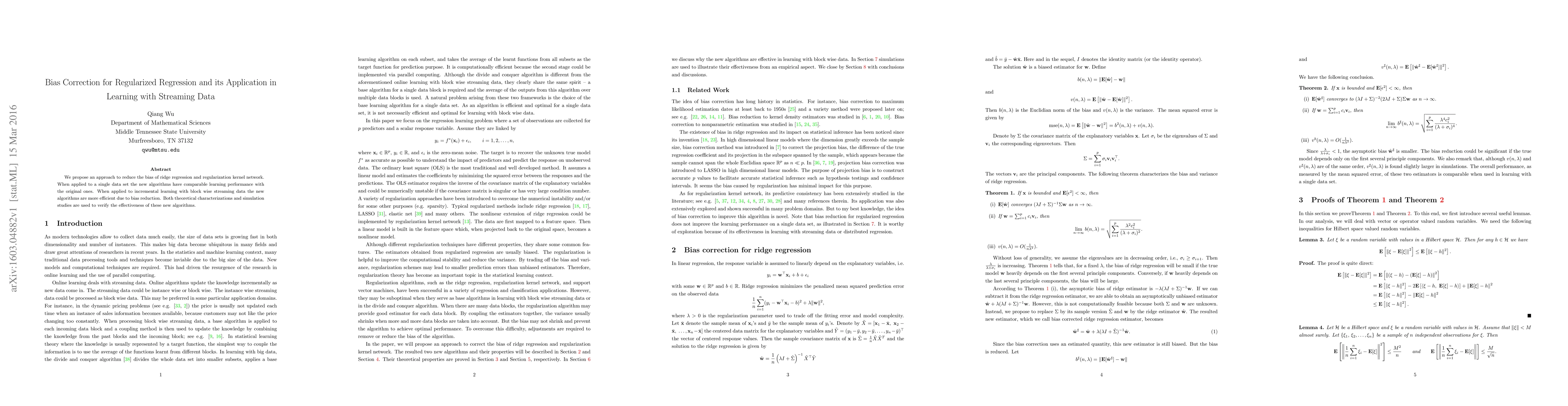 This paper introduces a method to correct bias in ridge regression and regularization kernel networks, showing comparable performance on static datasets but enhanced efficiency in incremental learning with streaming data. Theoretical analysis and simulations confirm the effectiveness of the proposed bias correction algorithms.