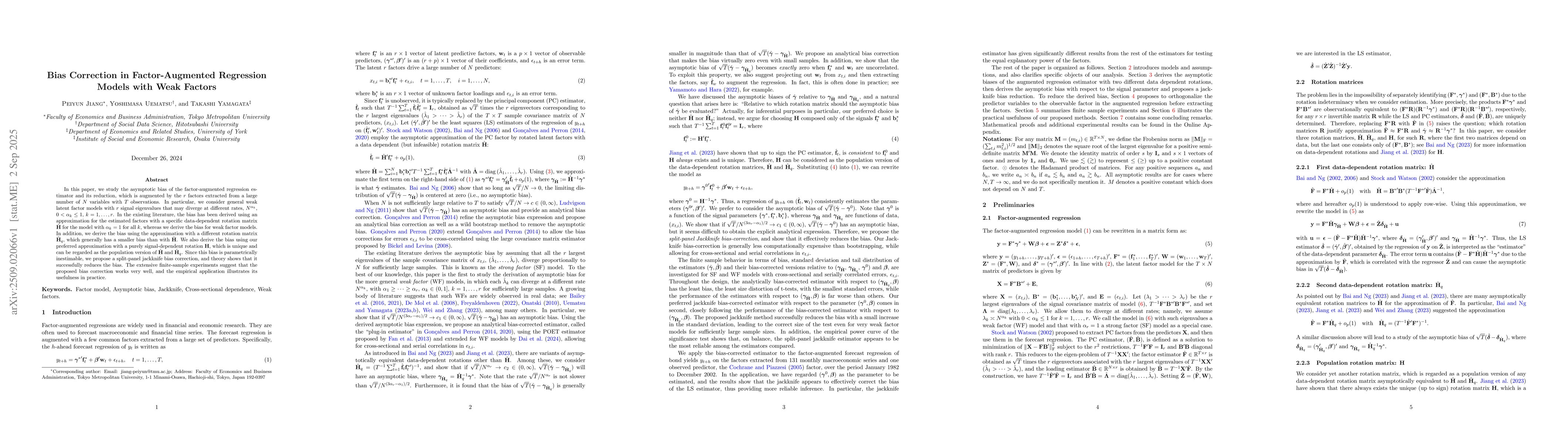 In this paper, we study the asymptotic bias of the factor-augmented regression estimator and its reduction, which is augmented by the $r$ factors extracted from a large number of $N$ variables with $T$ observations. In particular, we consider general weak latent factor models with $r$ signal eigenvalues that may diverge at different rates, $N^{\alpha _{k}}$, $0<\alpha _{k}\leq 1$, $k=1,\dots,r$. In the existing literature, the bias has been derived using an approximation for the estimated factors with a specific data-dependent rotation matrix $\hat{H}$ for the model with $\alpha_{k}=1$ for all $k$, whereas we derive the bias for weak factor models. In addition, we derive the bias using the approximation with a different rotation matrix $\hat{H}_q$, which generally has a smaller bias than with $\hat{H}$. We also derive the bias using our preferred approximation with a purely signal-dependent rotation $H$, which is unique and can be regarded as the population version of $\hat{H}$ and $\hat{H}_q$. Since this bias is parametrically inestimable, we propose a split-panel jackknife bias correction, and theory shows that it successfully reduces the bias. The extensive finite-sample experiments suggest that the proposed bias correction works very well, and the empirical application illustrates its usefulness in practice.