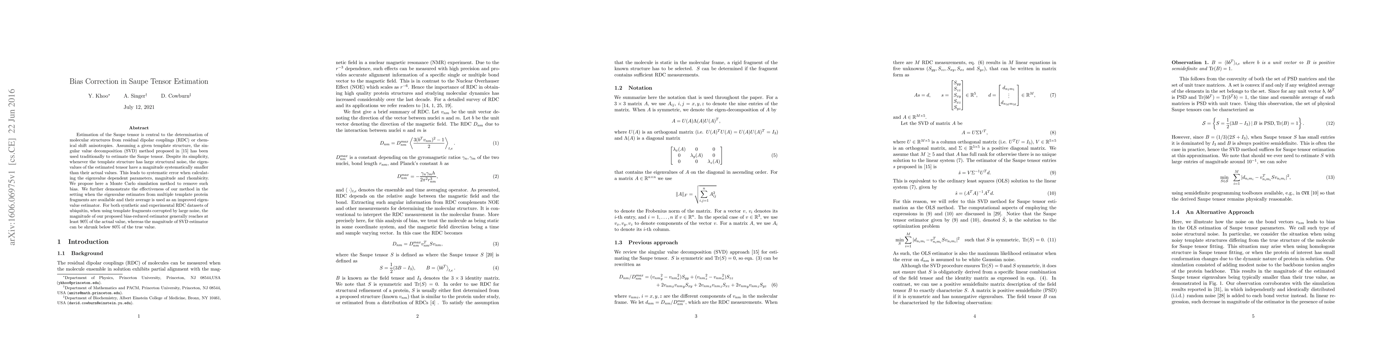 Estimation of the Saupe tensor is central to the determination of molecular structures from residual dipolar couplings (RDC) or chemical shift anisotropies. Assuming a given template structure, the singular value decomposition (SVD) method proposed in Losonczi et al. 1999 has been used traditionally to estimate the Saupe tensor. Despite its simplicity, whenever the template structure has large structural noise, the eigenvalues of the estimated tensor have a magnitude systematically smaller than their actual values. This leads to systematic error when calculating the eigenvalue dependent parameters, magnitude and rhombicity. We propose here a Monte Carlo simulation method to remove such bias. We further demonstrate the effectiveness of our method in the setting when the eigenvalue estimates from multiple template protein fragments are available and their average is used as an improved eigenvalue estimator. For both synthetic and experimental RDC datasets of ubiquitin, when using template fragments corrupted by large noise, the magnitude of our proposed bias-reduced estimator generally reaches at least 90% of the actual value, whereas the magnitude of SVD estimator can be shrunk below 80% of the true value.