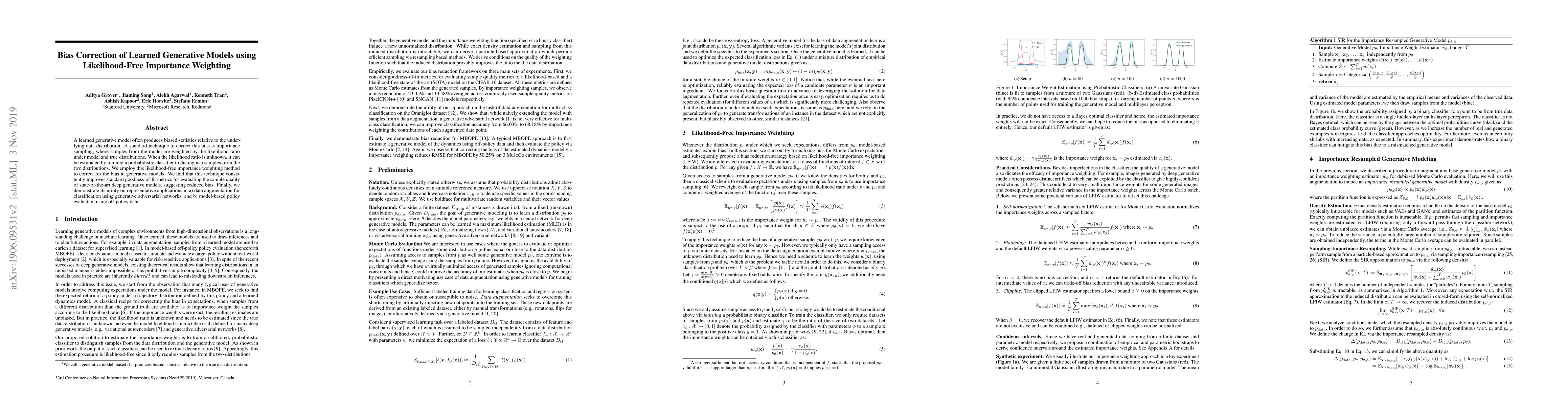 This paper proposes a likelihood-free importance weighting method to correct bias in generative models, showing consistent improvement in fit metrics and demonstrating its utility in data augmentation and policy evaluation. The technique estimates the likelihood ratio without direct likelihood calculations, using a classifier to distinguish model samples from true data.