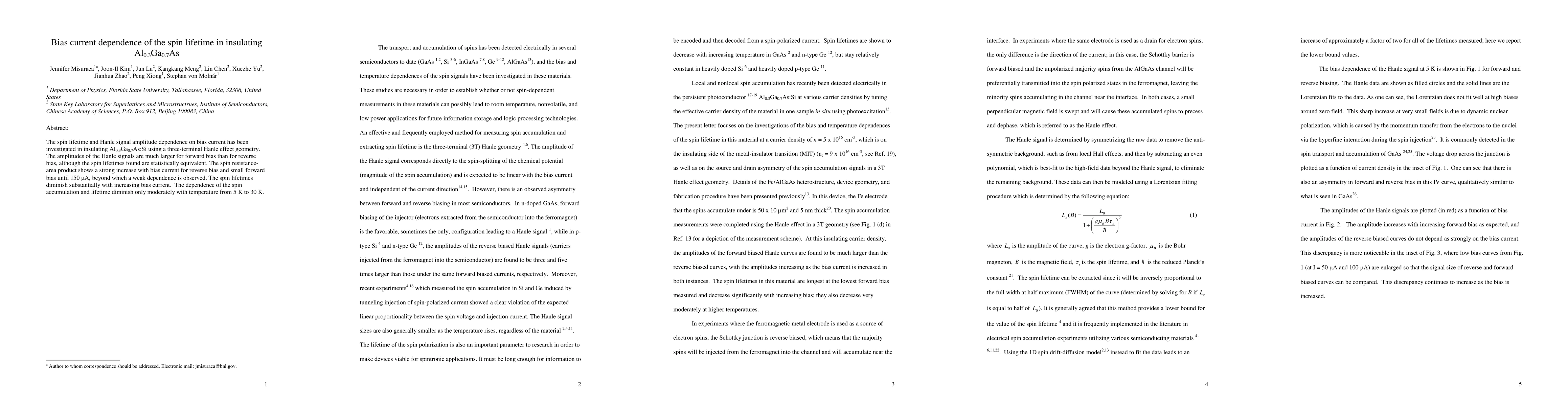 The spin lifetime and Hanle signal amplitude dependence on bias current has been investigated in insulating Al$_{0.3}$Ga$_{0.7}$As:Si using a three-terminal Hanle effect geometry. The amplitudes of the Hanle signals are much larger for forward bias than for reverse bias, although the spin lifetimes found are statistically equivalent. The spin resistance-area product shows a strong increase with bias current for reverse bias and small forward bias until 150 $\mu$A, beyond which a weak dependence is observed. The spin lifetimes diminish substantially with increasing bias current. The dependence of the spin accumulation and lifetime diminish only moderately with temperature from 5 K to 30 K.