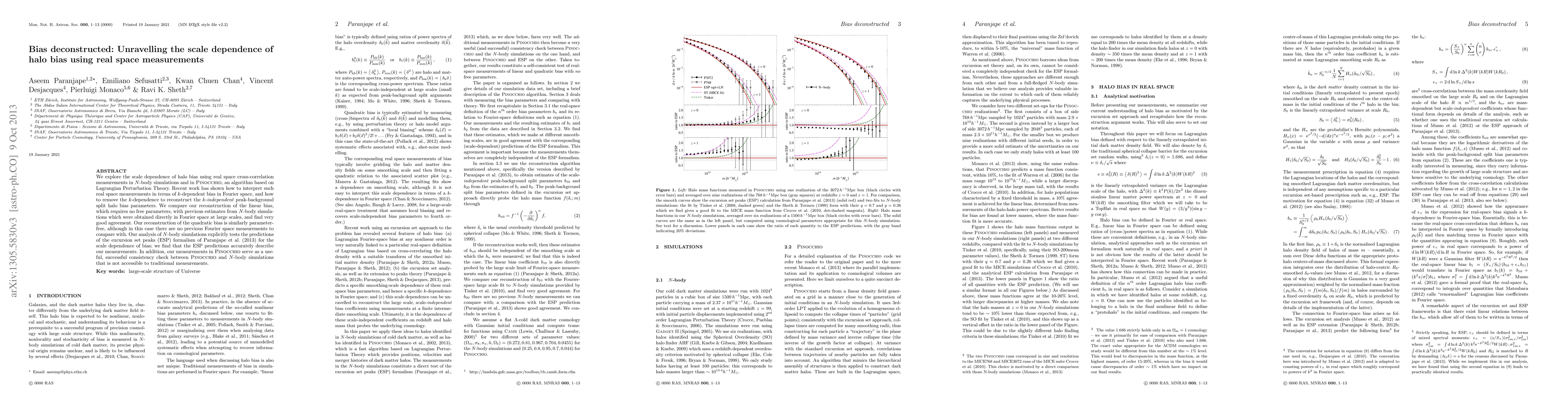 We explore the scale dependence of halo bias using real space cross-correlation measurements in N-body simulations and in Pinocchio, an algorithm based on Lagrangian Perturbation Theory. Recent work has shown how to interpret such real space measurements in terms of k-dependent bias in Fourier space, and how to remove the k-dependence to reconstruct the k-independent peak-background split halo bias parameters. We compare our reconstruction of the linear bias, which requires no free parameters, with previous estimates from N-body simulations which were obtained directly in Fourier space at large scales, and find very good agreement. Our reconstruction of the quadratic bias is similarly parameter-free, although in this case there are no previous Fourier space measurements to compare with. Our analysis of N-body simulations explicitly tests the predictions of the excursion set peaks (ESP) formalism of Paranjape et al. (2013) for the scale dependence of bias; we find that the ESP predictions accurately describe our measurements. In addition, our measurements in Pinocchio serve as a useful, successful consistency check between Pinocchio and N-body simulations that is not accessible to traditional measurements.
