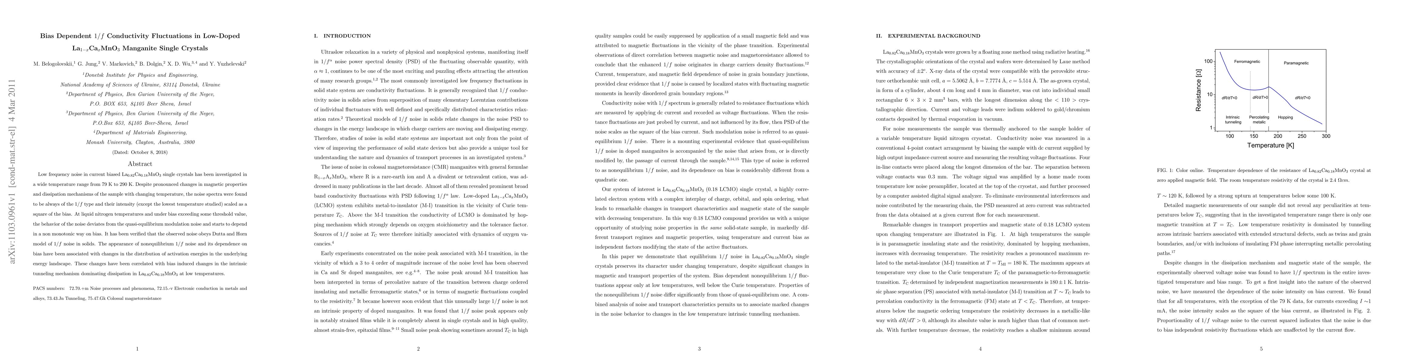 The study investigates low-frequency noise in La0.82Ca0.18MnO3 manganite single crystals under varying bias and temperatures, finding the noise is always 1/f type and scales with bias squared. At low temperatures, noise behavior deviates from quasi-equilibrium and becomes bias-dependent, linked to changes in activation energy distribution and intrinsic tunneling mechanisms.