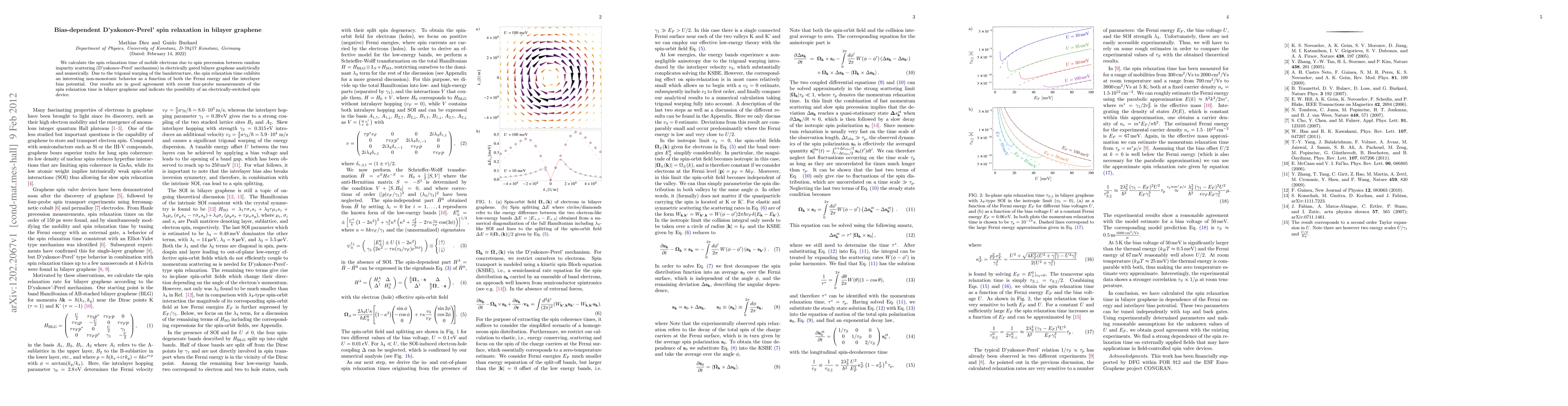 This study analyzes the spin relaxation time in bilayer graphene due to the D'yakonov-Perel' mechanism, showing a non-monotonic dependence on both Fermi energy and interlayer bias, potentially enabling electrically-switched spin devices. The findings align well with recent experimental measurements.