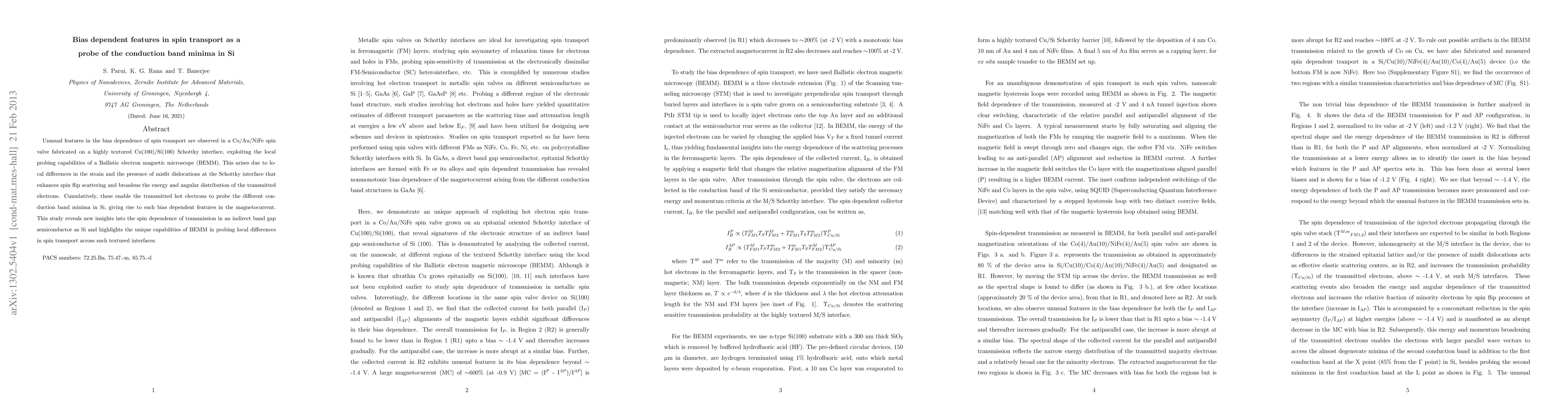 Unusual features in the bias dependence of spin transport are observed in a Co/Au/NiFe spin valve fabricated on a highly textured Cu(100)/Si(100) Schottky interface, exploiting the local probing capabilities of a Ballistic electron magnetic microscope (BEMM). This arises due to local differences in the strain and the presence of misfit dislocations at the Schottky interface that enhances spin flip scattering and broadens the energy and angular distribution of the transmitted electrons. Cumulatively, these enable the transmitted hot electrons to probe the different conduction band minima in Si, giving rise to such bias dependent features in the magnetocurrent. This study reveals new insights into the spin dependence of transmission in an indirect band gap semiconductor as Si and highlights the unique capabilities of BEMM in probing local differences in spin transport across such textured interfaces.