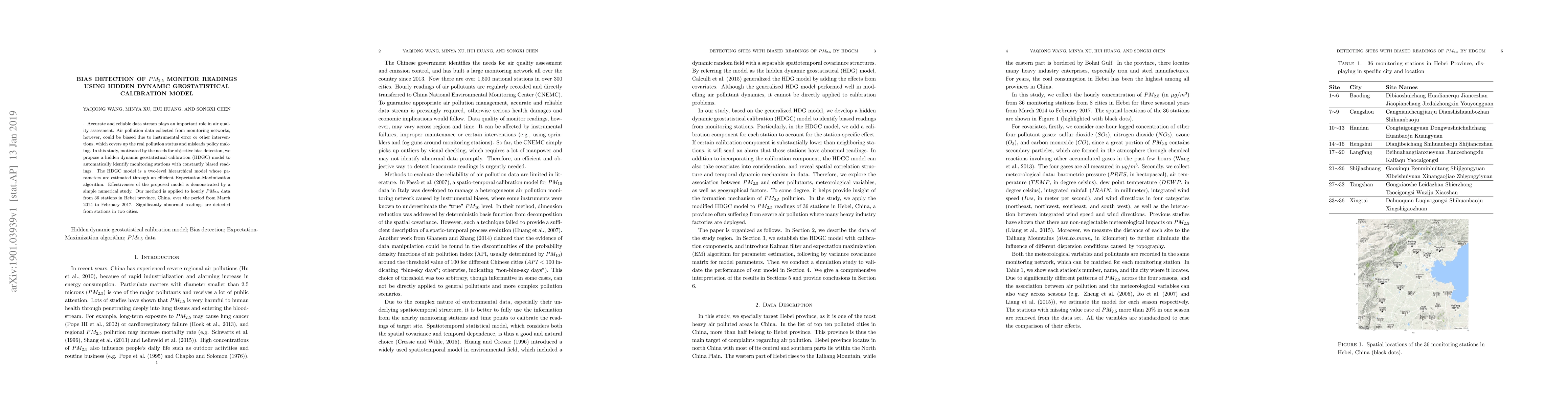 Accurate and reliable data stream plays an important role in air quality assessment. Air pollution data collected from monitoring networks, however, could be biased due to instrumental error or other interventions, which covers up the real pollution status and misleads policy making. In this study, motivated by the needs for objective bias detection, we propose a hidden dynamic geostatistical calibration (HDGC) model to automatically identify monitoring stations with constantly biased readings. The HDGC model is a two-level hierarchical model whose parameters are estimated through an efficient Expectation-Maximization algorithm. Effectiveness of the proposed model is demonstrated by a simple numerical study. Our method is applied to hourly $PM_{2.5}$ data from 36 stations in Hebei province, China, over the period from March 2014 to February 2017. Significantly abnormal readings are detected from stations in two cities.
