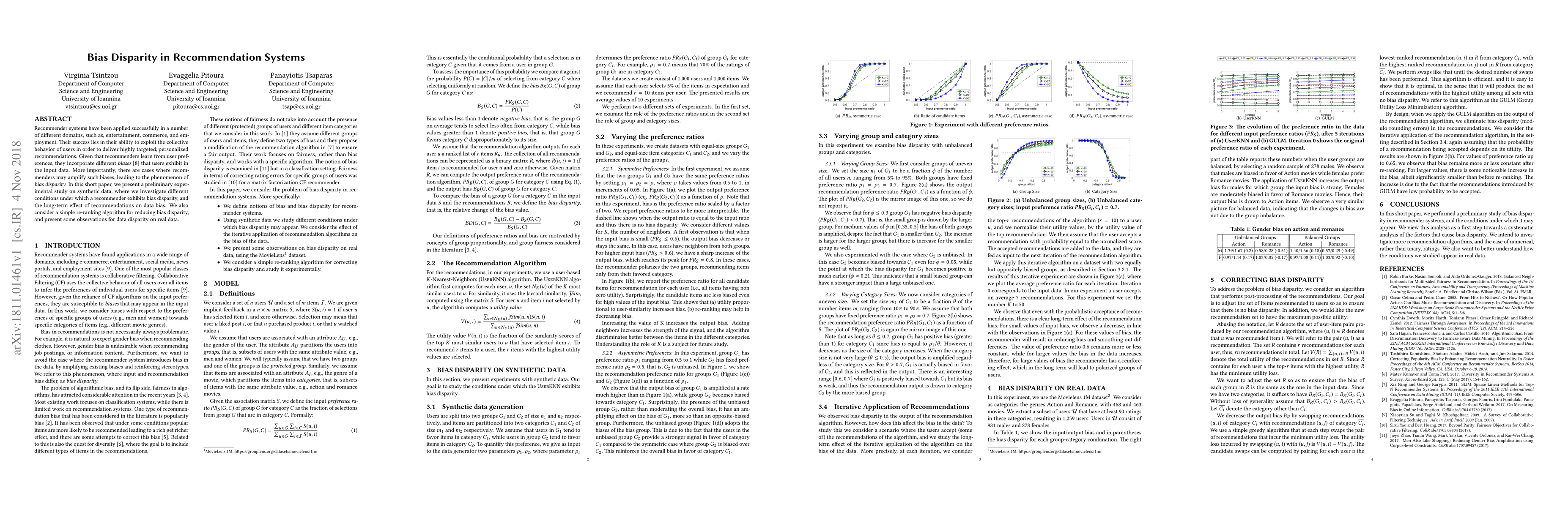 Recommender systems have been applied successfully in a number of different domains, such as, entertainment, commerce, and employment. Their success lies in their ability to exploit the collective behavior of users in order to deliver highly targeted, personalized recommendations. Given that recommenders learn from user preferences, they incorporate different biases that users exhibit in the input data. More importantly, there are cases where recommenders may amplify such biases, leading to the phenomenon of bias disparity. In this short paper, we present a preliminary experimental study on synthetic data, where we investigate different conditions under which a recommender exhibits bias disparity, and the long-term effect of recommendations on data bias. We also consider a simple re-ranking algorithm for reducing bias disparity, and present some observations for data disparity on real data.