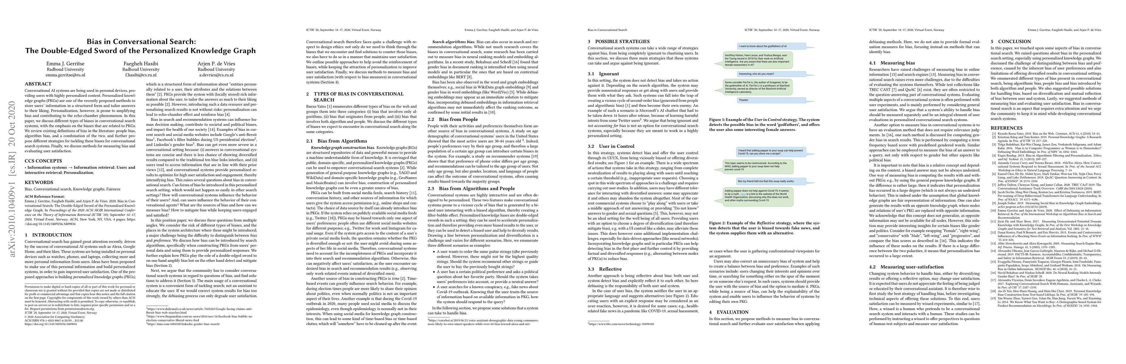 Conversational AI systems are being used in personal devices, providing users with highly personalized content. Personalized knowledge graphs (PKGs) are one of the recently proposed methods to store users' information in a structured form and tailor answers to their liking. Personalization, however, is prone to amplifying bias and contributing to the echo-chamber phenomenon. In this paper, we discuss different types of biases in conversational search systems, with the emphasis on the biases that are related to PKGs. We review existing definitions of bias in the literature: people bias, algorithm bias, and a combination of the two, and further propose different strategies for tackling these biases for conversational search systems. Finally, we discuss methods for measuring bias and evaluating user satisfaction.