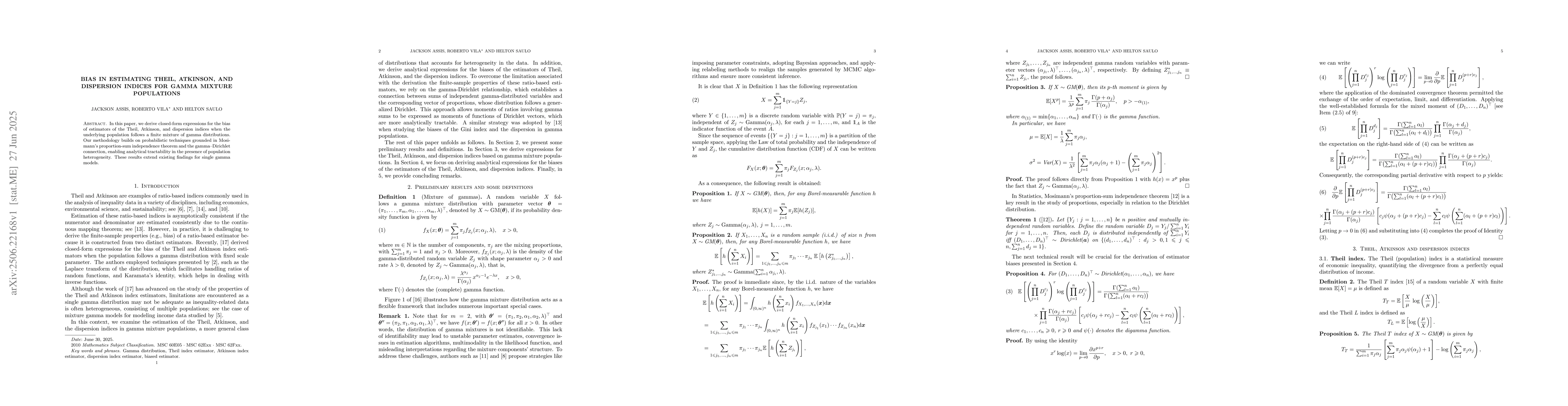 This research derives closed-form expressions for bias in estimating Theil, Atkinson, and dispersion indices for gamma mixture populations, utilizing Mosimann's theorem and gamma-Dirichlet connection, extending previous findings for single gamma models.